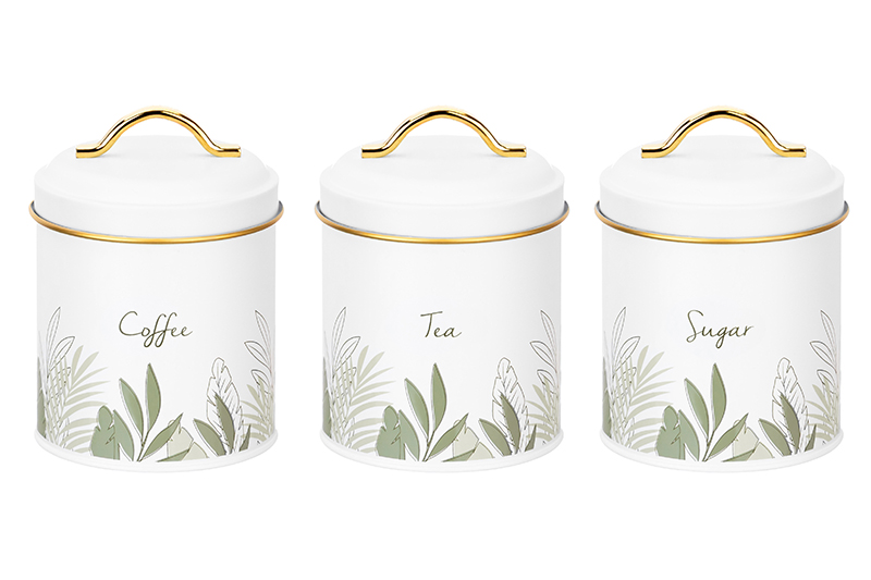 Набор 3 банок для сыпучих продуктов по 1,1 литра от бренда Elan Gallery станет удобным и эстетичным дополнением вашей кухни. Размер каждого изделия – 11,7х11,7х15,5 см, высота каждой банки без крышки – 12,5 см. Круглые ёмкости белого цвета выполнены из металла с пудровым покрытием. Каждая баночка имеет крышку с золотой ручкой в форме петельки. Ёмкости позволят красиво хранить продукты на полке или в шкафу, а также станут украшением домашнего интерьера. Имеют стильный дизайн, поэтому подходят для эстетичного хранения на столе, а также для сервировки. Металлические банки украшены надписями "Sugar" ("Сахар"), "Tea" ("Чай"), "Coffee" ("Кофе") и рисунком с листьями в белых и зелёных оттенках. Благодаря кухонным органайзерам сыпучие продукты будут всегда под рукой. Комплект трёх контейнеров позволит не просто хранить чай, кофе и сахар на вашей кухне, но и станет элементом её декора. Не рекомендуется применять абразивные моющие средства. Нельзя использовать в микроволновой печи и посудомоечной машине. Поставляются в стильной картонной коробке. Набор посуды из 3 предметов станет украшением кухни или приятным подарком на любой праздник. Благодаря красочной коробочке не потребуется подарочная упаковка. В коллекции бренда Элан Галерея представлено много кухонных органайзеров, сахарниц, столового инвентаря и других стильных товаров для дома. Выберите вариант на свой вкус.