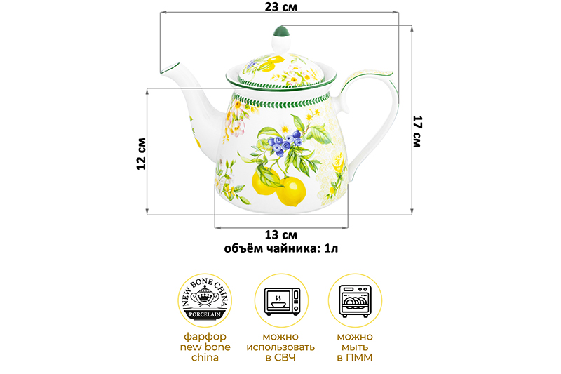 Чайник из серии «Лимоны» станет стильным дополнением вашей кухни. Размер изделия – 23х13х17 см, объём – 1 литр. Выполнен из фарфора new bone china, сочетающего в себе изящность и высокую прочность. За счёт гладкости изделия легко отмываются, поэтому долго сохраняют привлекательный вид и практичны в использовании. Плотная структура материала позволяет посуде дольше сохранять температуру блюд и напитков. От других видов костяного фарфора new bone china отличается большей экологичностью в производстве. Фарфоровая посуда с ярким рисунком в виде лимонов станет изящным дополнением интерьера любой кухни или столовой. Подходит для ежедневного заваривания чая и станет незаменимым элементом организации любого чаепития. Насладитесь любимым напитком и удивите гостей красивой сервировкой как в будни, так и на праздник. Благодаря фильтру в виде маленьких отверстий в стеночке вы можете наслаждаться ароматной заваркой без попадания мелких чаинок. С обратной стороны фарфоровой крышечки имеется язычок, благодаря которому она будет хорошо держаться на чайнике. Не рекомендуется применять абразивные моющие средства. Подходит для использования в посудомоечной машине. Поставляется в красивой картонной коробке – благодаря ей вам не потребуется дополнительная подарочная упаковка. Чайник станет оригинальным подарком для любой хозяйки и незаменимым элементом сервировочного инвентаря в вашем доме!