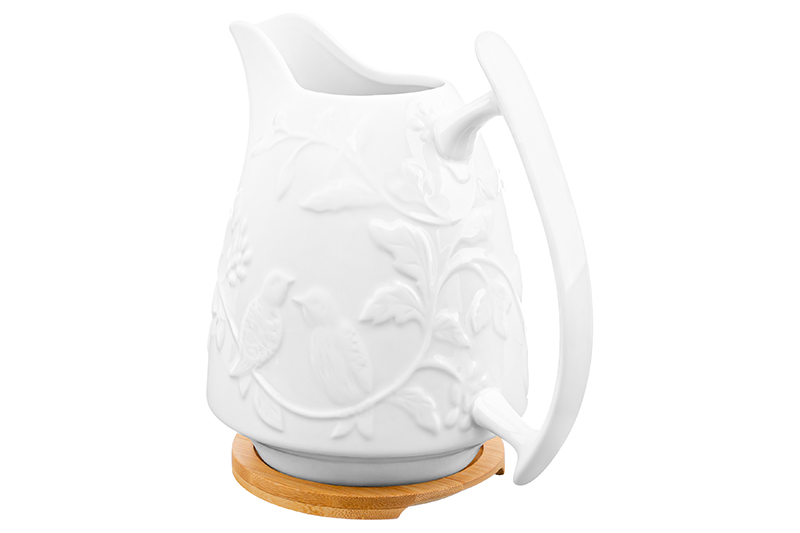 Кувшин Elan Gallery "Птички на ветке" объёмом 1,9 литра и размером 20х14,5х21 см выполнен из фарфора и станет красивым дополнением вашей кухни. Украшен рельефным узором в виде птичек и веточек. В комплекте имеет круглую подставку из натурального бамбука. Фарфоровый сосуд можно использовать для воды или молока. Кувшин может стать прекрасной альтернативой скучным пакетам сока и отлично подходит для сервировки компотов, коктейлей и любых других напитков. Не рекомендуется применять абразивные моющие средства. Без бамбуковой подставки можно использовать в посудомоечной машине и микроволновой печи. Поставляется в стильной картонной упаковке. Кувшин станет чудесным подарком для любой женщины. Серия «Птички на ветке» позволит собрать сервиз в едином стиле и станет настоящим украшением вашего дома!