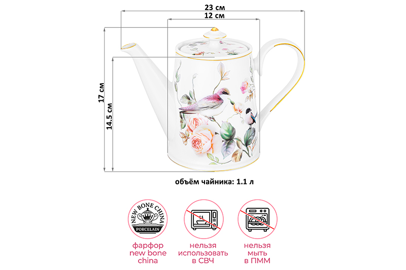 Чайник Elan Gallery "Певчие птички" размером 23х12х17 см и объёмом 1,1 литра станет украшением вашей кухни. Посуда выполнена из фарфора нового поколения new bone china, сочетающего в себе изящность и высокую прочность. За счёт гладкости изделия легко отмываются, поэтому сохраняют привлекательный внешний вид и практичны в использовании. Плотная структура материала позволяет посуде дольше сохранять температуру напитков. От костяного фарфора new bone china отличается большей экологичностью в производстве. Посуда с изображениями птичек и розовых цветов украшена золотистым кантом. Фарфоровый чайничек подходит для заваривания чая каждый день и станет незаменимым предметом для организации любого чаепития. Вы сможете удивить гостей красивой сервировкой стола как в будни, так и на праздник. Чайник подойдёт для любых горячих напитков и удобен в использовании. Он оснащен фильтром в виде маленьких отверстий в стеночке, благодаря которому вы сможете наслаждаться ароматной заваркой без попадания мелких чаинок. На фарфоровой крышке с обратной стороны есть небольшой выступ, чтобы она хорошо держалась на чайнике. Не рекомендуется применять абразивные моющие средства. Нельзя использовать в микроволновой печи и посудомоечной машине. Поставляется в подарочной картонной упаковке. Фарфоровая посуда – приятный подарок на любой праздник. Благодаря красочной дизайнерской коробочке не понадобится дополнительная подарочная упаковка, если вы решите преподнести сюрприз. Красивый дизайн и функциональность подарочного чайника понравятся каждому, а высокое качество фарфора обеспечит его долговечность. В коллекции бренда Элан Галерея представлено много стильных товаров для дома, в том числе всё для эстетичного чаепития. Выберите варианты на свой вкус!