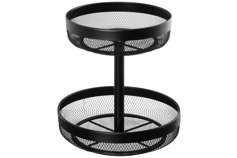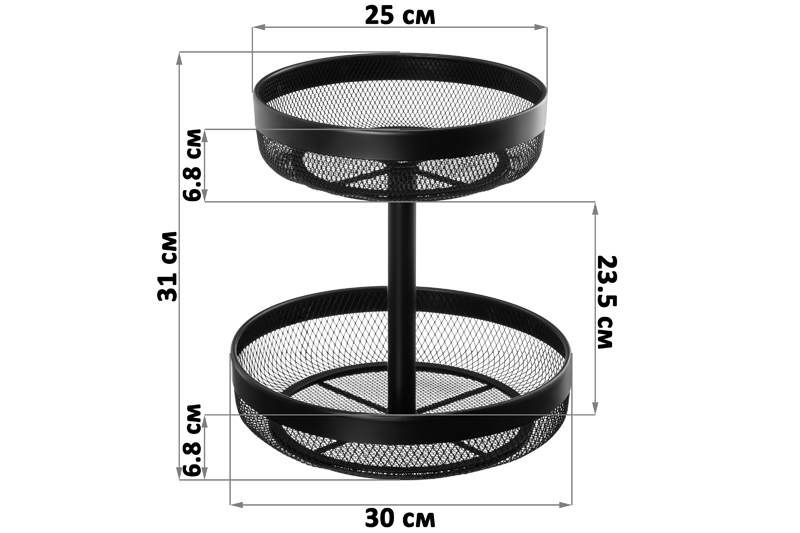 Декоративная двухъярусная корзина для фруктов ELCASA 30х30х31 см изготовлена из прочного металла. Размер нижней корзины 30х30х6,8 см, размер верхней корзины 25х25х6,8 см, расстояние между корзинами 23,5 см. Этажерка чёрного цвета имеет устойчивую конструкцию, стильный дизайн и выполнена в оригинальной геометрической форме. Два яруса представляют собой вместительные чаши из металлической сетки. Металлическое блюдо – это универсальное решение для интерьера вашего дома или офиса. Можно разместить в вазе фрукты на кухне, а также украсить корзинкой гостиную или приемную. Фруктовница эстетично впишется в самые разные стили интерьера: лофт, сканди, минимализм и подойдёт для эстетичного хранения овощей и фруктов. Удобный кухонный аксессуар для сервировки поможет организовать порядок на вашей кухне. Сервировочная фруктовая подставка не только дополнит декор праздничного стола, но и подойдет для пикника или дачи. Такая стильная посуда порадует ваших гостей и сделает застолье еще приятнее! Органайзер подойдёт для хранения конфет в роли большой конфетницы или других мелочей. Не рекомендуется применять абразивные моющие средства. Нельзя мыть в посудомоечной машине. Большая настольная корзина для фруктов станет отличным подарком на любой праздник. Подарите стильный кухонный инвентарь своим близким – такая вещь всегда пригодится в быту. Сетчатая корзина для фруктов станет украшением вашей столовой или приятным сюрпризом для родных и близких!