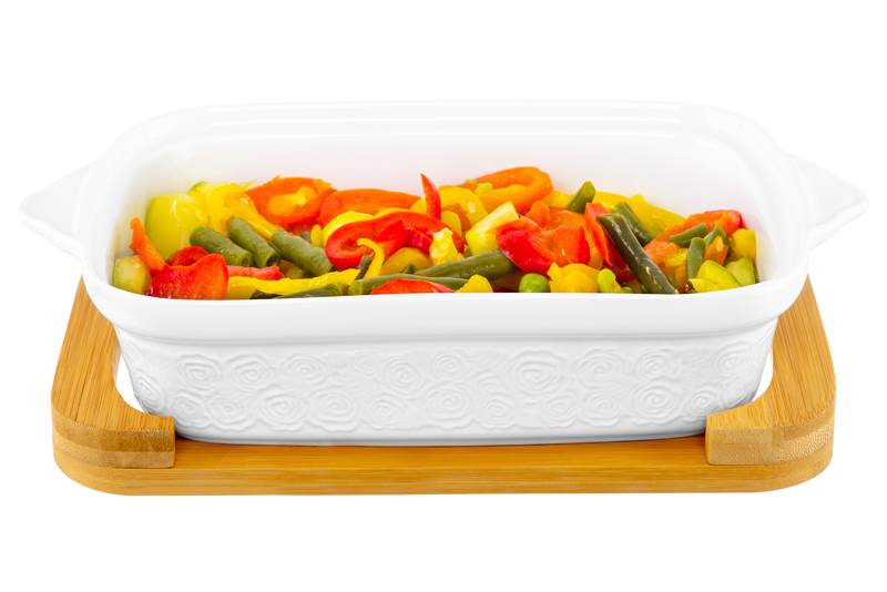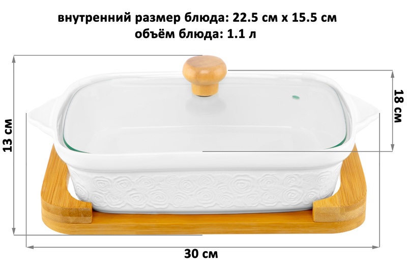 Блюдо из серии «Розы» от Elan Gallery предназначено для приготовления и эстетичной подачи ваших любимых блюд. Размер изделия – 30х18х13 см, объём – 1,1 литра. Внутренний размер блюда – 22,5х15,5 см. Выполнено из высококачественного белого фарфора. Он не впитывает цвет продуктов и легко отмывается, благодаря чему надолго сохраняет свою белизну. Поверхность изделия украшают рельефные узоры в виде пышных бутонов роз. Крышка выполнена из стекла, ручка на крышке и подставка выполнены из натурального бамбука. Изделие подойдёт для подачи сельди под шубой, салатов и плова. Используйте глубокую ёмкость в роли шубницы, чтобы порадовать гостей любимым праздничным блюдом. Послужит в качестве салатника или для подачи закусок из мяса и рыбы. Такая посуда поможет вам в приготовлении заливного и желе. Крышка поможет сохранить температуру блюд, а удобная деревянная ручка облегчит её снятие и не даст обжечься. Подставка защитит поверхности от воздействия высоких температур и послужит в качестве подноса для безопасной и комфортной подачи блюда к столу. Без крышки и подставки блюдо подойдёт для запекания бисквита и творожных запеканок. Изделие подойдёт для сервировки большого брикета мороженого, которое можно разделить с семьёй или друзьями. Не рекомендуется применять абразивные моющие средства. Без крышки и подставки подходит для использования в посудомоечной машине, микроволновой печи и духовом шкафу при температуре до 230 градусов. Бамбук нельзя замачивать! Поставляется в дизайнерской картонной коробке – благодаря ей вам не потребуется дополнительная подарочная упаковка. Фарфоровая сервировочная посуда будет оригинальным подарком для хозяйки, ценящей не только практичность, но и привлекательность. Серия «Розы» от бренда Элан Галерея станет украшением любого кухонного инвентаря и позволит собрать красивый сервиз в едином стиле!