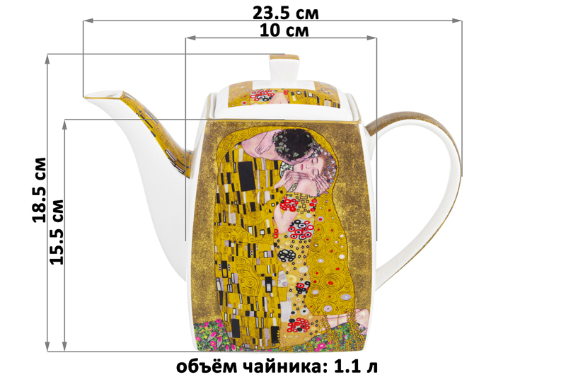 Чайник серии "Поцелуй" объемом 1,1 литра поможет провести множество приятных чаепитий. Чайник украшен роскошными репродукциями картины Густава Климта "Поцелуй" и обрамлен золотым окаймлением. Выполнен из высококачественного фарфора New Bone China. Это фарфор нового поколения, не уступающий традиционному костяному по качеству, но при этом гораздо более экологичный в производстве. Чайник в носике имеет фильтрующие отверстия против чаинок. Крышка чайника удерживается с помощью язычка. Размер изделия 23,5х10х18,5 см. Чайник не подходит для использования в микроволновой печи и посудомоечной машине. Поставляется в подарочной упаковке. Чайник из серии посуды "Поцелуй" сможет стать настоящим украшением кухни или приятным подарком для ваших родных и близких!