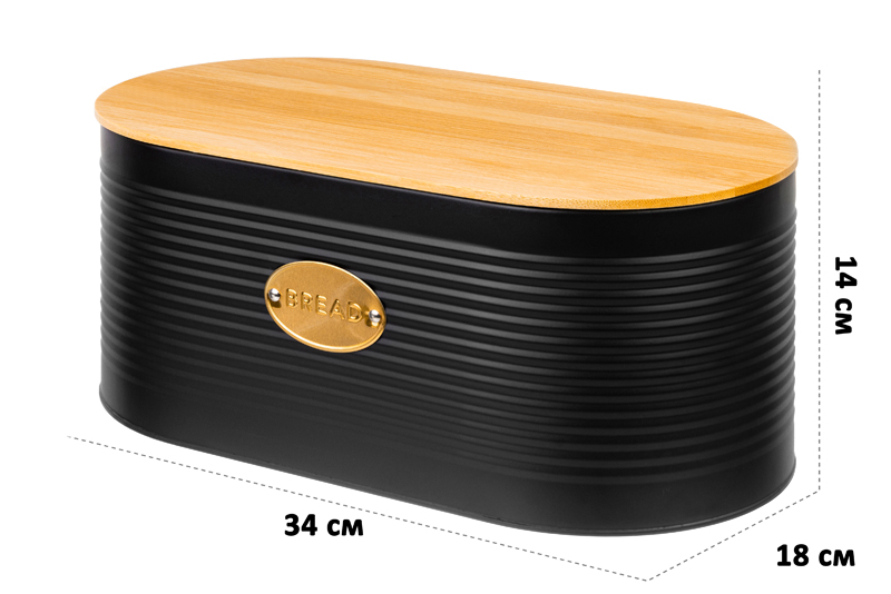 Чёрная хлебница 34х18х14 см с бамбуковой крышкой-доской поможет сохранить хлеб и булочки вкусными и свежими. Контейнер из металла не впитывает запахи, держит температуру, предотвращает попадание влаги, а значит – защитит продукты от плесени. Настольная хлебница имеет стильный дизайн и надежно закрывается бамбуковой крышкой. Её особенность – необычный функционал 2 в 1. Вам больше не понадобится отдельная доска для того, чтобы нарезать хлеб перед подачей на стол. Просто откройте крышку и используйте её как доску. Металлическую ёмкость можно приспособить не только под хлеб, но и для хранения пакетов с крекерами, печеньем, сухарями. Бамбуковые детали нельзя замачивать. Поставляется в стильной картонной упаковке. Красивый кухонный инвентарь подойдёт в подарок любой хозяйке. Такая посуда станет настоящим украшением вашей кухни или столовой и поможет создать в доме порядок и уют!