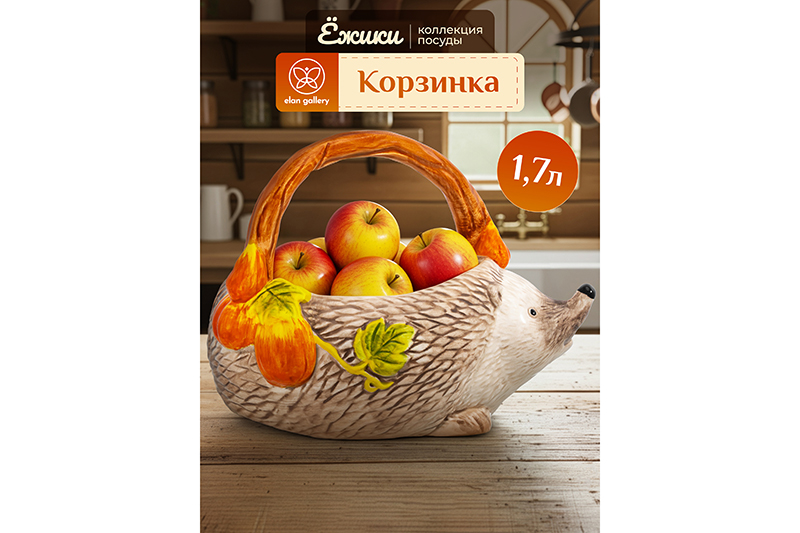 Корзинка для конфет из серии «Ёжики» от Elan Gallery предназначена для эстетичной сервировки вашего стола. Размер изделия – 24х17,5х17,5 см, объём – 1,7 литров. Размер дна – 16,5х14 см. Выполнена из керамики в виде милого ёжика, несущего на спине маленькие тыковки. Тыква как символ изобилия вплетена в сюжет коллекции. Она ассоциируется с уютными осенними вечерами и волшебной атмосферой Хэллоуина. Фигурное изделие послужит в качестве конфетницы для подачи сладостей и десертов, а также любых других закусок и угощений. Задействуйте её как в повседневной сервировке, так и на празднике. Заполните изделие конфетами, печеньем, безе или зефиром. Подайте в нём овощную и фруктовую нарезку, а также свежие фрукты и овощи, орехи и сухофрукты. Используйте для небольших кондитерских изделий, например, пирожных и эклеров. Привнесите уют в любое чаепитие. Благодаря необычному дизайну корзина разнообразит интерьер любой кухни, столовой или гостиной. Не рекомендуется применять абразивные моющие средства. Не подходит для посудомоечной машины и микроволновой печи. Поставляется в дизайнерской картонной коробке – благодаря ей вам не потребуется дополнительная подарочная упаковка. Коллекция «Ёжики» от бренда Элан Галерея – это посуда, где каждая деталь создана с теплом и раскрашена оттенками осени!