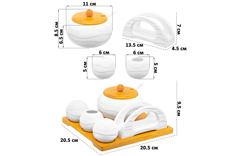 Сервировочный набор из серии «Айсберг волны» от Elan Gallery предназначен для красивой подачи на стол специй и сыпучих продуктов. Состоит из сахарницы с ложкой, двух баночек для специй, подставки для зубочисток (в комплект не входят) и салфетницы. Общий размер набора – 20,5х20,5х8,5 см. Размер сахарницы – 11x11x8,5 см, объём – 310 мл, длина ложечки – 13 см. Размер маленьких ёмкостей – 6х6х5 см, объём – 75 мл. Размер салфетницы – 13,5х4,5х7 см. Изделия выполнены из высококачественного белого фарфора. Он не впитывает цвет продуктов и легко отмывается, благодаря чему надолго сохранит свою белизну. Поверхность изделий украшают рельефные узоры в виде поперечных волн. Крышка сахарницы и подставка выполнены из натурального бамбука. Набор гармонично дополнит сервировку любого стола. Контейнеры подойдут для хранения сыпучих продуктов. Эстетичную сахарницу также можно приспособить под варенье, мёд или икру. Вы с лёгкостью наберёте необходимое количество продукта с помощью ложечки, которая компактно помещается в баночку благодаря выемке на крышке. Отлично послужит в качестве медовницы и станет альтернативой традиционным медовым горшочкам и бочонкам! Заполните маленькие ёмкости специями и приправами, чтобы во время приготовления еды всё необходимое было под рукой. Наполняются через отверстия снизу и закрываются пластиковыми пробками. Салфетница и подставка под зубочистки помогут вам хранить средства гигиены, необходимые во время приёма пищи. Не рекомендуется применять абразивные моющие средства. Без бамбуковых и пластиковых элементов изделия подходят для использования в посудомоечной машине и микроволновой печи. Бамбук нельзя замачивать! Поставляется в дизайнерской картонной упаковке. Фарфоровая сервировочная посуда послужит оригинальным подарком для хозяйки, ценящей не только практичность, но и привлекательность. Серия «Айсберг волны» станет украшением любого кухонного инвентаря и позволит собрать сервиз в едином стиле!