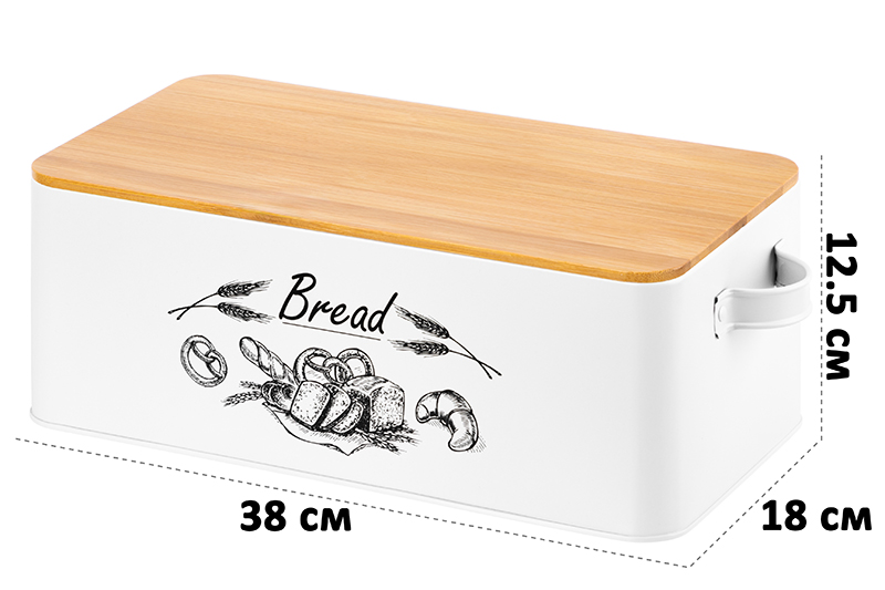 Хлебница с деревянной крышкой-доской предназначена для организации хранения продуктов на вашей кухне. Размер изделия – 38х18х12,5 см, размер крышки – 33х18х1,5 см. Белый контейнер выполнен из металла, крышка – из натурального бамбука. На боковую стенку нанесена надпись «Bread» («Хлеб») и рисунок разнообразной выпечки. Металлическая ёмкость не впитывает запахи, держит температуру, предотвращает попадание влаги и развитие плесени. Плотно прилегающая крышка надёжно защитит содержимое. Стильный дизайн настольного органайзера впишет его в интерьер любой кухни или столовой. Особенность изделия – это функционал 2 в 1: бамбуковая крышка также послужит в качестве разделочной доски. Вам больше не понадобится отдельное приспособление для того, чтобы нарезать хлеб перед подачей на стол. Прочные удобные ручки позволят легко переносить хлебницу, поэтому она подойдёт для сервировки стола. Большую прямоугольную ёмкость можно приспособить не только под хлеб и выпечку, но и для хранения пакетов с печеньем или конфетами. Не рекомендуется применять абразивные моющие средства. Не использовать в посудомоечной машине. Красивая хлебница станет отличным подарком для любой хозяйки и функциональным элементом декора. Она поможет навести в доме порядок и создать атмосферу уюта.