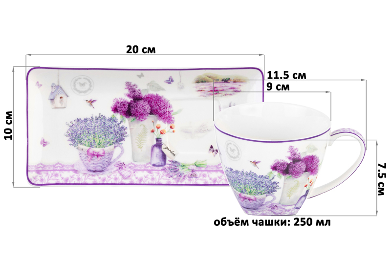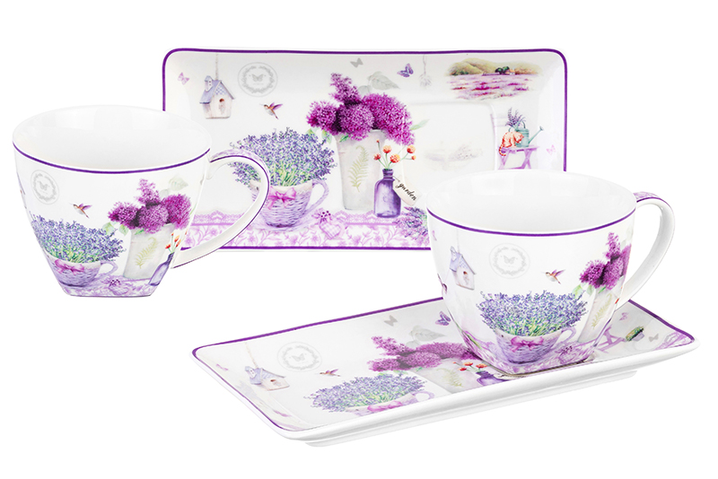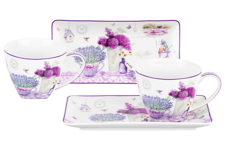 Набор 2 чайных пар Elan Gallery "Лаванда" выполнен из фарфора new bone china. New bone china сочетает в себе изящность и высокую прочность. От других видов костяного фарфора материал отличается большей экологичностью в производстве. Серия "Лаванда" украшена нежным принтом на тему Прованса – французской провинции, которая славится своими лавандовыми полями и красивыми пейзажами. Изображение пышных букетов лаванды и гортензии позволит окунуться в атмосферу тепла, гармонии и южного солнца, не покидая вашей кухни или столовой! Объём каждой чашки – 250 мл, размер блюдца для десерта – 20х10х2 см. Каждое блюдечко имеет необычную прямоугольную форму. Кружка с блюдцем подходят ценителям чая и кофе, которые любят пить из красивой и необычной посуды. Интересная чашка с удобной ручкой украсит ваш стол своим стильным дизайном как на праздник, так и в будни. Это идеальный вариант для того, чтобы согреться горячим чаем зимой и освежиться прохладным лимонадом летом. Используйте блюдце как подставку для чашки, чтобы порадовать гостей изящной сервировкой. Положите на него кусочек торта, домашнего пирога или пирожное. Небольшая тарелочка подойдёт не только для десерта, но и закусок: сырной нарезки, сырокопчёной колбасы или свежих овощей и зелени. Не рекомендуется применять абразивные моющие средства. Можно использовать в микроволновой печи и посудомоечной машине. Поставляется в красивой картонной упаковке. Чайный набор на 2 персоны станет приятным подарком на любой праздник или украшением вашего стола.