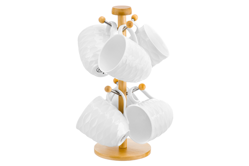 Набор состоит из 6 кружек серии «Айсберг волны» объемом по 320 мл на подставке из бамбука. Размер каждой кружки – 12х8,5х9,5 см. Размер подставки – 12,5х12,5х32 см. Кружечки выполнены из качественного фарфора и украшены рельефными узорами. Подходят для любых напитков: чая, кофе, лимонада или сока. Кружки помогут провести множество приятных завтраков с капучино или латте, а также уютных чайных вечеров. Пейте из них кефир или молоко всей семьёй. Фарфоровая посуда не впитывает цвет напитков и долгое время будет выглядеть, как новая! Без бамбуковой подставки кружечки можно использовать в микроволновой печи и посудомоечной машине. Бамбук нельзя замачивать! Набор поставляется в стильной картонной упаковке. Посуда серии «Айсберг волны» станет настоящим украшением кухни или приятным подарком для ваших родных и близких!