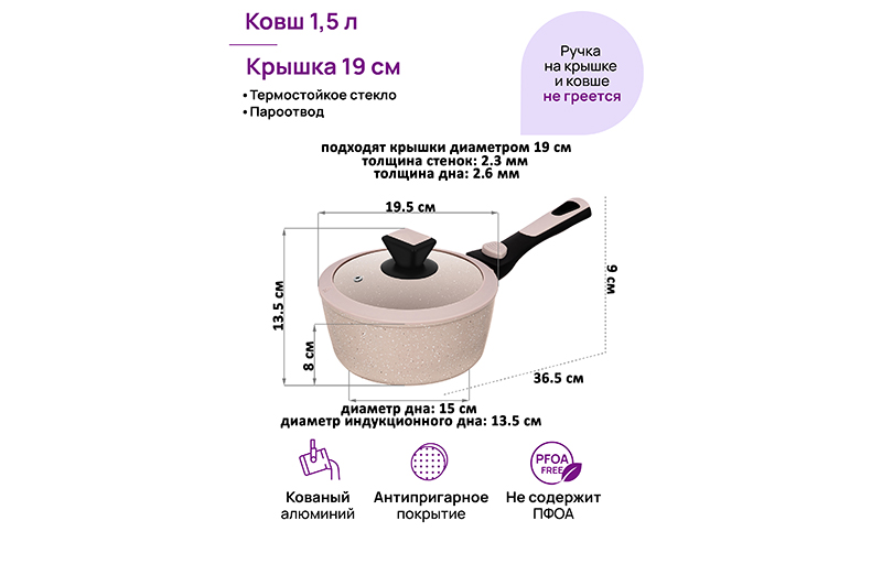 Ковш «Бежевый мрамор» из серии Fierra имеет размер 36,5х19,5х13,5 см и объём 1,5 литра. Высота изделия без крышки – 8 см, диаметр дна – 15 см, диаметр индукционного дна – 13,5 см. Длина ручки – 16,5 см. Изготовлен из кованого алюминия, имеет ультрапрочное антипригарное покрытие PFLUON COOКMARK. Оно устойчиво к износу и царапинам, не содержит PFOA и другие вредные вещества. Изделие равномерно нагревается и распределяет тепло, благодаря чему продукты к нём надолго сохраняют сочность и полезные свойства. Ручка из бакелита легко снимается, без неё ёмкость легко поместится в холодильник и в духовку. Покрытие Soft touch обеспечивает дополнительный комфорт при переноске. Стеклянная крышка с тремя пароотводами позволит вам следить за степенью готовности блюд, а большая пластиковая ручка обеспечит удобство снятия. После мытья поверхность изделия моментально высыхает, и вам не придётся вытирать его или долго сушить. Алюминиевый ковш поможет в приготовлении вкусных блюд дома. Используйте его для варки супов и пюре. Приготовьте на завтрак кашу или омлет. Запеките мясо по-французски и порадуйте своих близких. Благодаря лёгкому весу удобен для повседневного использования. С помощью жаропрочного ковша вы создадите кулинарные шедевры на своей кухне. Эксплуатация: не нагревайте без продуктов. Ставьте посуду строго по центру источника тепла. Не используйте металлические принадлежности, пользуйтесь силиконовыми и деревянными лопатками. Без крышки и ручки можно использовать в духовом шкафу при температуре до 230 градусов. Не используйте съёмную ручку, чтобы достать раскалённую сковородку из духовки. Подходит для всех типов плит, включая индукцию. Не используйте абразивные и щелочные средства. Подходит для использования в посудомоечной машине в режиме «Эко». Красивый ковш станет отличным подарком любой хозяйке. Пополните свой кухонный инвентарь и привнесите удовольствие в процесс приготовления пищи!