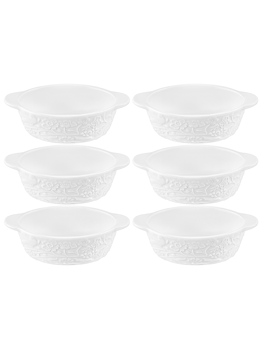 Набор 6 жюльенниц-кокотниц с крышками от Elan Gallery из серии "Райский сад" предназначен для эстетичной сервировки вашего стола. Размер каждой жюльенницы – 16х10х8 см, внутренний размер – 12,5х8,5х4,5 см, объём – 250 мл. Каждая кокотница выполнена из белого фарфора и украшена изысканным рельефным узором с цветами. Фарфор не впитывает цвет продуктов и легко отмывается, благодаря чему надолго сохранит свою белизну. Красивая формочка подойдёт для запекания душистого жюльена, а также приготовления кондитерских и кулинарных изделий. Эстетичную ёмкость можно тут же подавать на стол после приготовления благодаря удобным ручкам. Используйте горшочек в качестве сахарницы или солонки, наполните небольшим количеством специй, приправ и других сыпучих продуктов, чтобы всё необходимое всегда было под рукой. Подойдёт для выпекания порционных десертов, например, творожных запеканок и крем-брюле. Станет стильным дополнением стола на любом чаепитии. Благодаря лаконичному дизайну посуда впишется в интерьер любой квартиры, кухни и столовой. Беречь от механических повреждений и резких перепадов температур. Не рекомендуется применять абразивные моющие средства. Подойдёт для использования в посудомоечной машине, микроволновой печи и духовом шкафу при температуре до 230 градусов. Поставляется в картонной коробке с логотипом бренда – благодаря ей вам не потребуется дополнительная подарочная упаковка! Станет приятным подарком на любой праздник. Серия "Райский сад" станет украшением любого кухонного инвентаря и позволит собрать сервиз в едином стиле!