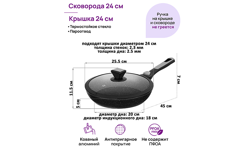 Глубокая сковорода «Чёрный мрамор» из серии Fierra имеет размер 42х25,5х11,5 см. Высота без крышки – 5 см, диаметр дна – 20 см, диаметр индукционного дна – 18 см. Длина ручки – 20 см. Изготовлена из кованого алюминия, имеет ультрапрочное антипригарное покрытие PFLUON COOКMARK. Оно устойчиво к износу и царапинам, не содержит PFOA и другие вредные вещества. Изделие равномерно нагревается и распределяет тепло, благодаря чему продукты к нём надолго сохраняют сочность и полезные свойства. Ручка из бакелита легко снимается, без неё ёмкость поместится в холодильник и в духовку. Покрытие Soft touch обеспечивает дополнительный комфорт при переноске. Стеклянная крышка с тремя пароотводами позволит вам следить за степенью готовности блюд, а большая пластиковая ручка обеспечит удобство снятия. После мытья поверхность изделия моментально высыхает, и вам не придётся вытирать его или долго сушить. Алюминиевая сковорода поможет в приготовлении вкусных блюд дома. Используйте её для жарки котлет, стейков или картофеля с минимальным количеством масла. Приготовьте на завтрак оладьи, яичницу или омлет. Порадуйте близких большим количеством блинов на Масленицу – ни один блинчик не подгорит. Запеките румяную курочку и порадуйте своих близких. Благодаря лёгкому весу удобна для повседневного использования. Эксплуатация: не нагревайте без продуктов. Ставьте посуду строго по центру источника тепла. Не используйте металлические принадлежности, пользуйтесь силиконовыми и деревянными лопатками. Без крышки и ручки можно использовать в духовом шкафу при температуре до 230 градусов. Не используйте съёмную ручку, чтобы достать раскалённую сковородку из духовки. Подходит для всех типов плит, включая индукцию. Не используйте абразивные и щелочные средства. Подходит для использования в посудомоечной машине в режиме «Эко». Красивая сковородка станет отличным подарком любой хозяйке. Пополните свой кухонный инвентарь и привнесите удовольствие в процесс приготовления пищи!