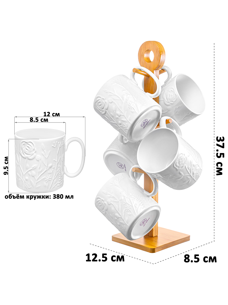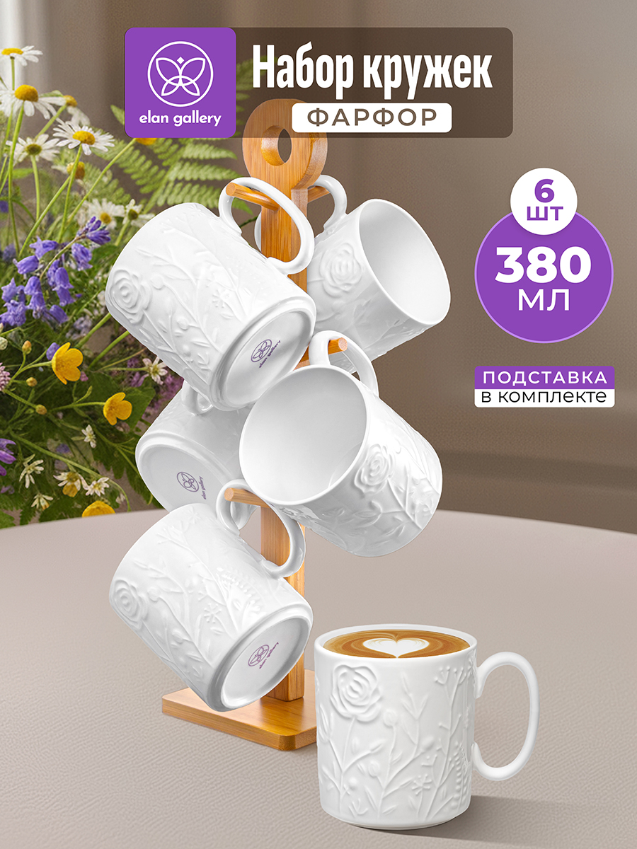 Набор 6 кружек "Полевые цветы" выполнен из белого фарфора, украшен рельефными узорами. Подставка из натурального бамбука вверху имеет удобную ручку для переноса. Она позволит компактно и красиво хранить чайный набор даже на маленькой кухне. Общий размер набора с подставкой – 12х8,5х37,5 см. Размер каждой кружечки – 12х8,5х9,5 см, объём – 380 мл. Фарфоровые изделия подойдут ценителям чая и кофе, любящим пить из красивой и необычной посуды. Это идеальный вариант для того, чтобы согреться горячим напитком зимой или освежиться прохладным лимонадом летом. Белые бокалы с ручками украсят ваш стол своим стильным дизайном как в будни, так и на праздники. Они помогут провести множество приятных завтраков и уютных вечеров, а также устроить чаепитие для всей семьи. Пейте ягодный морс, домашний лимонад или американо. В отличие от керамики фарфор легко отмывается и не впитывает цвет даже самого крепкого напитка! Не рекомендуется применять абразивные моющие средства. Без бамбуковой подставки можно использовать в микроволновой печи и посудомоечной машине. Бамбук нельзя замачивать. Набор на 6 персон поставляется в стильной картонной коробке. Благодаря красивой коробочке с логотипом бренда не понадобится дополнительная подарочная упаковка. В ассортименте бренда Elan Gallery вы найдёте предметы декора и красивую посуду для приготовления и сервировки ваших любимых блюд.