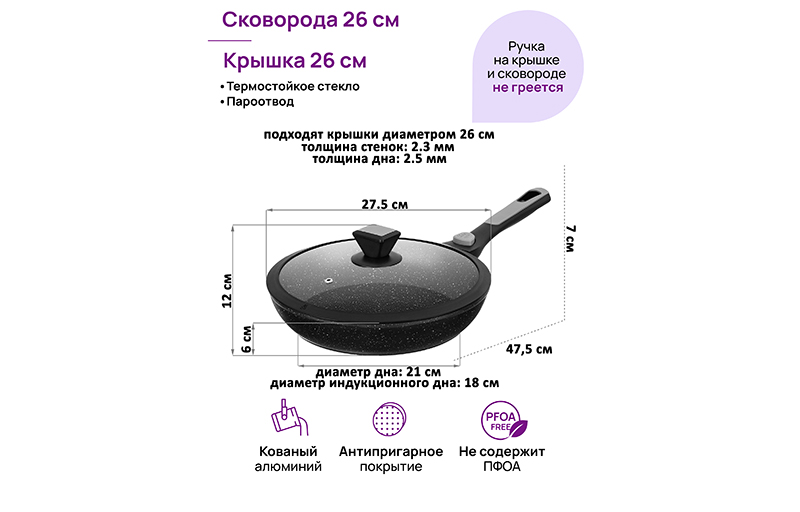Глубокая сковорода «Чёрный мрамор» из серии Fierra имеет размер 47,5х27,5х12 см. Высота без крышки – 6 см, диаметр дна – 21 см, диаметр индукционного дна – 18 см. Длина ручки – 20 см. Изготовлена из кованого алюминия, имеет ультрапрочное антипригарное покрытие PFLUON COOКMARK. Оно устойчиво к износу и царапинам, не содержит PFOA и другие вредные вещества. Изделие равномерно нагревается и распределяет тепло, благодаря чему продукты к нём надолго сохраняют сочность и полезные свойства. Ручка из бакелита легко снимается, без неё ёмкость поместится в холодильник и в духовку. Покрытие Soft touch обеспечивает дополнительный комфорт при переноске. Стеклянная крышка с тремя пароотводами позволит вам следить за степенью готовности блюд, а большая пластиковая ручка обеспечит удобство снятия. После мытья поверхность изделия моментально высыхает, и вам не придётся вытирать его или долго сушить. Алюминиевая сковорода поможет в приготовлении вкусных блюд дома. Используйте её для жарки котлет, стейков или картофеля с минимальным количеством масла. Приготовьте на завтрак оладьи, яичницу или омлет. Порадуйте близких большим количеством блинов на Масленицу – ни один блинчик не подгорит. Запеките румяную курочку и порадуйте своих близких. Благодаря лёгкому весу удобна для повседневного использования. Эксплуатация: не нагревайте без продуктов. Ставьте посуду строго по центру источника тепла. Не используйте металлические принадлежности, пользуйтесь силиконовыми и деревянными лопатками. Без крышки и ручки можно использовать в духовом шкафу при температуре до 230 градусов. Не используйте съёмную ручку, чтобы достать раскалённую сковородку из духовки. Подходит для всех типов плит, включая индукцию. Не используйте абразивные и щелочные средства. Подходит для использования в посудомоечной машине в режиме «Эко». Красивая сковородка станет отличным подарком любой хозяйке. Пополните свой кухонный инвентарь и привнесите удовольствие в процесс приготовления пищи!