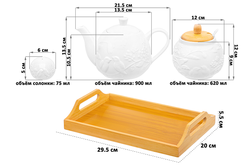 Набор Elan Gallery "Птички на ветке" на бамбуковой подставке с ручками выполнен из белого фарфора. Этот комплект станет воплощением прекрасного вкуса и поможет создать уют в вашем доме. Благодаря удобным ручкам на подносе посуду можно переносить из одной комнаты в другую. В состав набора входят: чайник заварочный объёмом 900 мл, сахарница 620 мл с бамбуковой крышкой и фарфоровой ложкой, вазочка под зубочистки и набор для специй (два предмета по 75 мл). Сахарницу можно использовать как баночку с крышкой для меда, варенья, орешков или икры. Чайник оснащен фильтром в виде маленьких отверстий в стеночке, благодаря которому вы сможете наслаждаться ароматной заваркой без попадания мелких чаинок. На фарфоровой крышке с обратной стороны есть небольшой выступ, чтобы она хорошо держалась на чайнике. Праздничный набор подходит для любителей чёрного, зелёного или травяного чая. Вы сможете удивить своих гостей красивой сервировкой стола как в будни, так и на праздник. Благодаря ёмкостям соль, приправы и специи всегда будут под рукой во время приёма или приготовления пищи. Не рекомендуется применять абразивные моющие средства. Без бамбуковых деталей можно использовать в микроволновой печи и посудомоечной машине. Бамбук нельзя замачивать! Поставляется в стильной картонной упаковке. Подарите чайный комплект с солонкой, перечницей и органайзером под зубочистки своим близким. Его красивый дизайн и функциональность оценит каждая хозяйка, а высокое качество фарфора и бамбука обеспечат долговечность этого подарка.