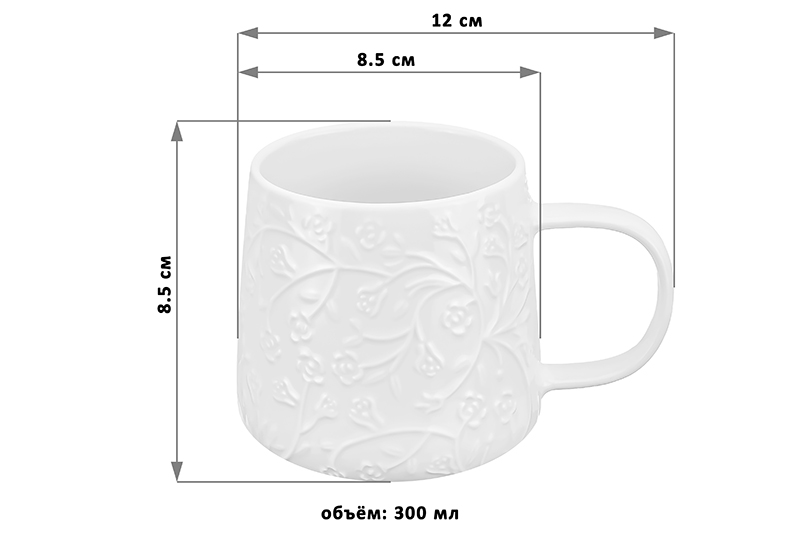 Кружка из серии «Веточки-цветочки» от Elan Gallery предназначена для эстетичной сервировки вашего стола. Размер изделия – 12х8,5х8,5 см, объём – 300 мл. Выполнена из высококачественного белого фарфора. Он не впитывает цвет напитков и легко отмывается, благодаря чему надолго сохраняет свою белизну. Поверхность изделия украшают рельефные узоры в виде лиственных веточек с аккуратными цветочными бутончиками. Кофейная кружка поможет вам провести множество приятных завтраков с капучино и латте, а также уютные чайные вечера с конфетами, вафлями, другими десертами и сладостями. Подойдёт ценителям чая и кофе, которые любят пить из красивой и необычной посуды. Согрейтесь зимой любимым горячим напитком: какао с маршмэллоу, ягодным чаем или горячим шоколадом. Летом освежитесь домашним лимонадом или морсом. Декоративное изделие позволит организовать запоминающееся чаепитие. Не рекомендуется применять абразивные моющие средства. Подходит для использования в посудомоечной машине и микроволновой печи. Поставляется в дизайнерской картонной коробке – благодаря ей вам не потребуется дополнительная подарочная упаковка. Фарфоровая сервировочная посуда будет оригинальным подарком для хозяйки, ценящей не только практичность, но и привлекательность. Серия «Веточки-цветочки» от бренда Элан Галерея станет украшением любого кухонного инвентаря и позволит собрать красивый сервиз в едином стиле!
