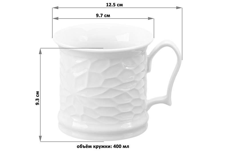 Кружка Elan Gallery "Витраж" размером 12,5х9,7х9,3 см и объёмом 400 мл выполнена из белого фарфора с рельефным узором. Кружечка подходит ценителям чая и кофе, которые любят пить из красивой и необычной посуды. Это идеальный вариант для того, чтобы согреться горячим напитком зимой и освежиться прохладным лимонадом летом. Интересная кружечка с удобной ручкой украсит ваш стол своим стильным дизайном как на праздник, так и в будни. Кружка поможет провести множество приятных завтраков с капучино или латте, а также уютных чайных вечеров. Фарфоровые изделия отличаются от керамических повышенной плотностью. Они не впитывают цвет кофе, чая, глинтвейна, других горячих напитков и не деформируются от влаги, чему может быть подвержена керамика. Можно использовать в микроволновой печи и мыть в посудомоечной машине. Поставляется в стильной картонной упаковке. Белая фарфоровая кружка "Витраж" порадует ваших близких на любой праздник или станет настоящим украшением вашей кухни!