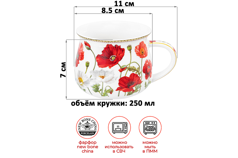 Кружка Elan Gallery "Маки" размером 11х8,5х7 см и объёмом 250 мл выполнена из фарфора нового поколения new bone china. New bone china сочетает в себе изящность и высокую прочность. От классического костяного фарфора материал отличается большей экологичностью в производстве. Кружка имеет оригинальную форму бочонка. Серия "Маки" украшена ярким принтом с крупными красными цветами. В коллекции вы найдёте любые принадлежности для эстетичной сервировки. Кружечка подходит ценителям чая и кофе, которые любят пить из красивой и необычной посуды. Это отличный вариант для того, чтобы согреться горячим какао зимой и освежиться прохладным лимонадом летом. Интересный бокал с удобной ручкой украсит ваш стол своим стильным дизайном как на праздник, так и в будни. Пейте молоко или кефир и наслаждайтесь красивой картинкой! В офисе станет незаменимым предметом для чаепития или перерыва на капучино и латте. Белая посуда из фарфора с красочным рисунком станет украшением интерьера вашей кухни и добавит ему нотки тепла и гармонии. В отличие от керамики она не впитывает цвет и запах напитка, легко отмывается и сохраняет свой привлекательный вид долгие годы. Не рекомендуется применять абразивные моющие средства. Можно использовать в микроволновой печи и мыть в посудомоечной машине. Поставляется в красочной картонной коробке. Фарфоровая посуда – хороший подарок женщине или девушке на любой праздник. Благодаря стильной коробочке вам не понадобится дополнительная подарочная упаковка! Наслаждайтесь любимыми напитками из этой кружечки сами, либо сделайте сюрприз своим близким! Серия "Маки" позволит собрать чайный или кофейный сервиз в едином стиле и станет украшением вашего дома.