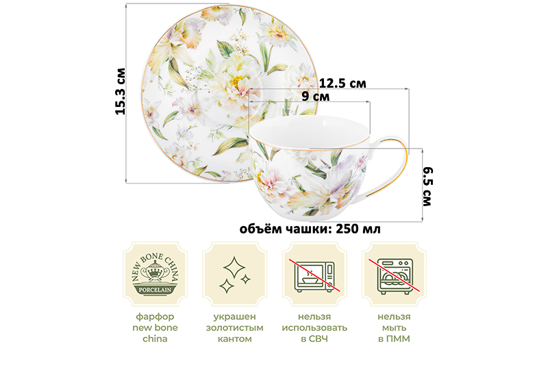 Набор 6 чайных пар из серии «Корнелия» от Elan Gallery предназначен для эстетичной сервировки вашего стола. Размер каждой ёмкости – 12,5х9х6,5 см, объём – 250 мл. Размер каждого блюдца – 15,3х15,3х2 см. Изготовлены из фарфора нового поколения new bone china, сочетающего в себе изящность и высокую прочность. За счёт гладкости изделия легко отмываются, поэтому сохраняют привлекательный внешний вид и практичны в использовании. Плотная структура материала позволяет посуде дольше сохранять температуру блюд и напитков. От других видов костяного фарфора new bone china отличается большей экологичностью в производстве. Поверхность изделий овивают изображения обворожительных белых пионов. Они выполнены в манере, вдохновлённой акварельным рисунком. Тонкая золотистая окантовка служит деликатным акцентом и подчёркивает их изысканность. Кофейные кружечки помогут провести множество приятных завтраков с капучино и латте, а также уютные чайные вечера с конфетами, вафлями, другими десертами и сладостями. Подойдут ценителям чая и кофе, которые любят пить из красивой и необычной посуды. Согрейтесь зимой любимым напитком: какао с маршмэллоу, ягодным чаем или горячим шоколадом. Летом освежитесь домашним лимонадом или морсом. Используйте сервировочные блюдца как подставки для чашек или заполните пирожными, кусочками торта и домашнего пирога. Подойдут для закусок: сырной нарезки, сырокопчёной колбасы или свежих овощей и зелени. Декоративный комплект позволит организовать запоминающееся чаепитие в большой компании. Не рекомендуется применять абразивные моющие средства. Не подходят для использования в посудомоечной машине и микроволновой печи. Поставляются в подарочной упаковке. Фарфоровая сервировочная посуда будет оригинальным подарком для хозяйки, ценящей не только практичность, но и привлекательность. Серия «Корнелия» от бренда Элан Галерея добавит вашему кухонному инвентарю лёгкости и элегантности, преобразив любую сервировку!