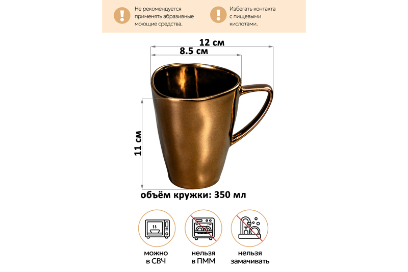 Кружка из серии «Бронза» станет стильным дополнением вашей кухни. Размер изделия – 12х8,5х11 см, объём – 350 мл. Выполнена из фарфора. Необычная геометрическая форма и бронзовый оттенок придают посуде лимитированной серии Bronze Fusion Porcelain Collection элегантный вид. Спокойный и гармоничный дизайн сочетает в себе прочность бронзы и изысканность фарфора. Кружка подойдёт ценителям чая и кофе, которые любят пить из красивой и необычной посуды. Это идеальный вариант для того, чтобы согреться горячим напитком зимой и освежиться прохладным лимонадом летом. Интересная кружечка с удобной ручкой украсит ваш стол стильным дизайном как на праздник, так и в будни. Подойдёт для использования в микроволновой печи. Нельзя использовать в посудомоечной машине, нельзя замачивать. Поставляется в стильной картонной упаковке. Кружка станет настоящим украшением вашего дома и чудесным подарком для любой хозяйки. Посуда лимитированной серии Bronze Fusion Porcelain Collection украсит кухонный интерьер и будет прекрасно сочетаться между собой!