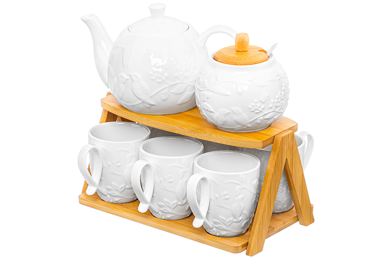 Набор Elan Gallery "Птички на ветке" на бамбуковой подставке выполнен из белого фарфора. Этот комплект станет воплощением прекрасного вкуса и поможет создать уют в вашем доме. В состав набора входят: чайник заварочный объёмом 900 мл, сахарница 620 мл с бамбуковой крышкой и фарфоровой ложкой, шесть кружек с изящными ручками в виде петельки. Объём каждого бокала – 300 мл. Чайный набор рассчитан на 6 персон. Сахарницу можно использовать как баночку с крышкой для меда, варенья, специй, орешков, цукатов или икры. Чайник оснащен фильтром в виде маленьких отверстий в стеночке, благодаря которому вы сможете наслаждаться ароматной заваркой без попадания мелких чаинок. На фарфоровой крышке с обратной стороны есть небольшой выступ, чтобы она хорошо держалась на чайнике. Праздничный набор подходит для любителей чёрного, зелёного или травяного чая. Вы сможете насладиться своими любимыми напитками из этих прекрасных классических чашек и удивить своих гостей красивой сервировкой стола как в будни, так и на праздник. Не рекомендуется применять абразивные моющие средства. Без бамбуковых деталей можно использовать в микроволновой печи и посудомоечной машине. Бамбук нельзя замачивать! Поставляется в стильной картонной упаковке. Подарите сервиз из фарфора с бамбуковыми деталями маме, бабушке, подруге, коллеге или сестре. Его красивый дизайн и функциональность понравятся каждому, а высокое качество фарфора и бамбука обеспечат долговечность этого подарка.