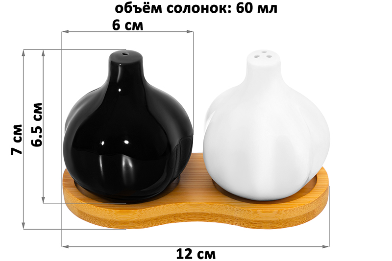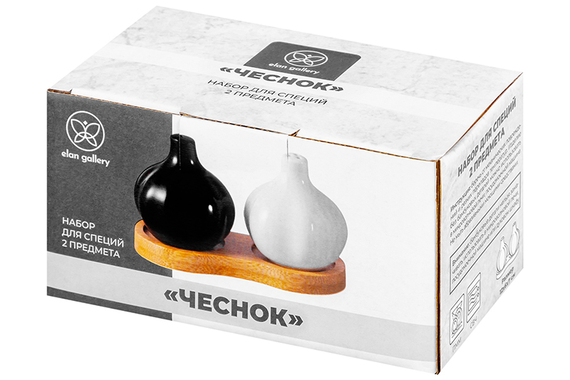 Набор для специй Elan Gallery "Чеснок" состоит из солонки и перечницы на бамбуковой подставке. Объём каждого изделия – 60 мл. Общий размер набора - 12х6х7 см, солонки – 6х6х6,5 см, перечницы – 6х6х6,5 см. Комплект изготовлен из фарфора и натурального бамбука. Ёмкости для специй белого и чёрного цвета выполнены в оригинальной форме и станут украшением вашего стола как в будни, так и на праздник. Внизу имеют отверстия для наполнения, которые закрываются пробками. В них можно насыпать соль, перец и любые специи. Фарфоровые детали без подставки можно мыть в посудомоечной машине. Изделия из бамбука нельзя замачивать! Столовый набор поставляется в стильной картонной упаковке. Набор для специй на подставке из бамбука станет настоящим украшением любой кухни или приятным подарком для ваших близких!