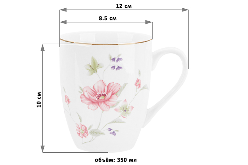 Кружка Elan Gallery "Диана" размером 12х8,5х10 см и объёмом 350 мл выполнена из качественного фарфора. Кружечка с изображениями розовых и фиолетовых цветов украшена золотистым кантом. Она поможет провести множество приятных завтраков с капучино или латте, а также уютных чайных вечеров. Кружка подходит ценителям чая и кофе, которые любят пить из красивой и необычной посуды. Это идеальный вариант для того, чтобы согреться горячим напитком зимой и освежиться прохладным лимонадом летом. Изящная кружка с удобной ручкой украсит ваш стол своим красивым дизайном как на праздник, так и в будни. Фарфоровая посуда отличается от керамической повышенной плотностью. Она не впитывает цвет кофе, чая, глинтвейна, других горячих напитков и не деформируется от влаги, чему может быть подвержена керамика. Не рекомендуется применять абразивные моющие средства. Из-за золотого канта не подходит для использования в СВЧ (микроволновой печи) и ПММ (посудомоечной машине). Поставляется в стильной картонной упаковке. Фарфоровые изделия – оригинальный подарок родным или друзьям, а также коллеге по работе. Подарите кружку маме, бабушке, дочке или подруге на любой праздник. Наслаждайтесь любимыми напитками из этой кружечки сами, либо сделайте оригинальный подарок своим близким!