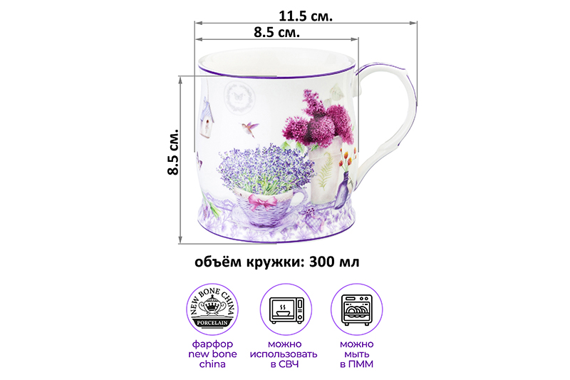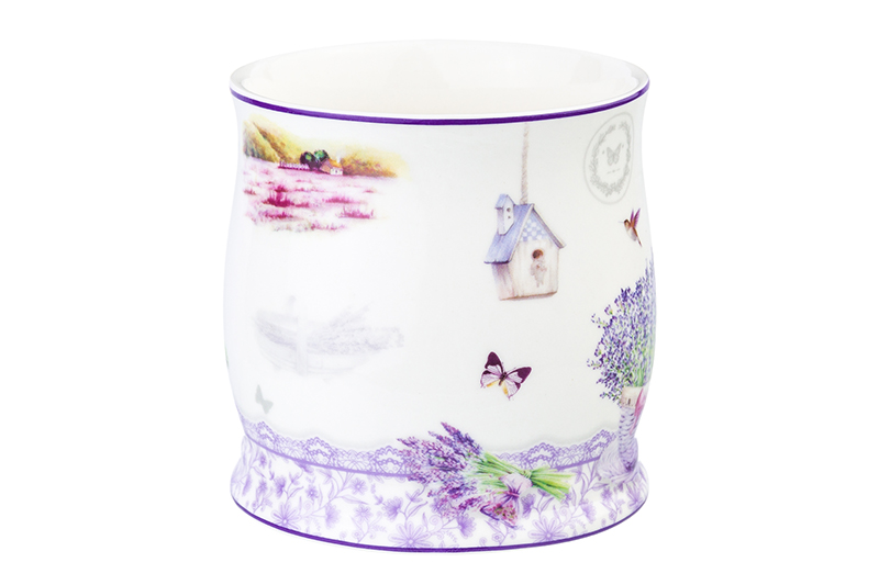 Кружка из серии «Лаванда» от Elan Gallery предназначена для эстетичной сервировки вашего стола. Размер ёмкости – 11,5х8,5х8,5 см, объём – 300 мл. Выполнена из фарфора нового поколения new bone china, сочетающего в себе изящность и высокую прочность. Такие изделия легко отмываются, поэтому сохраняют привлекательный вид и практичны в использовании. Плотная структура материала позволяет посуде дольше сохранять температуру блюд и напитков. От других видов костяного фарфора new bone china отличается большей экологичностью в производстве. Серия украшена нежным принтом на тему Прованса – французской провинции, которая славится своими лавандовыми полями и красивыми пейзажами. Изображение пышных букетов лаванды и гортензии позволит окунуться в атмосферу тепла, гармонии и южного солнца, не покидая вашей кухни или столовой! Кофейная кружка поможет провести множество приятных завтраков с капучино и латте, а также уютные чайные вечера с конфетами, вафлями, другими десертами и сладостями. Подойдёт ценителям чая и кофе, которые любят пить из красивой и необычной посуды. Согрейтесь зимой любимым напитком: какао с маршмэллоу, ягодным чаем или горячим шоколадом. Летом освежитесь домашним лимонадом или морсом. Не рекомендуется применять абразивные моющие средства. Подходит для использования в посудомоечной машине и микроволновой печи. Поставляется в дизайнерской картонной коробке – благодаря ей вам не потребуется дополнительная подарочная упаковка. Фарфоровая сервировочная посуда будет оригинальным подарком для хозяйки, ценящей не только практичность, но и привлекательность. Серия «Лаванда» от бренда Элан Галерея станет украшением любого кухонного инвентаря и позволит собрать красивый сервиз в едином стиле!