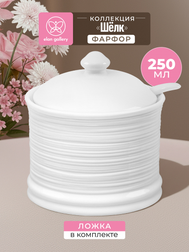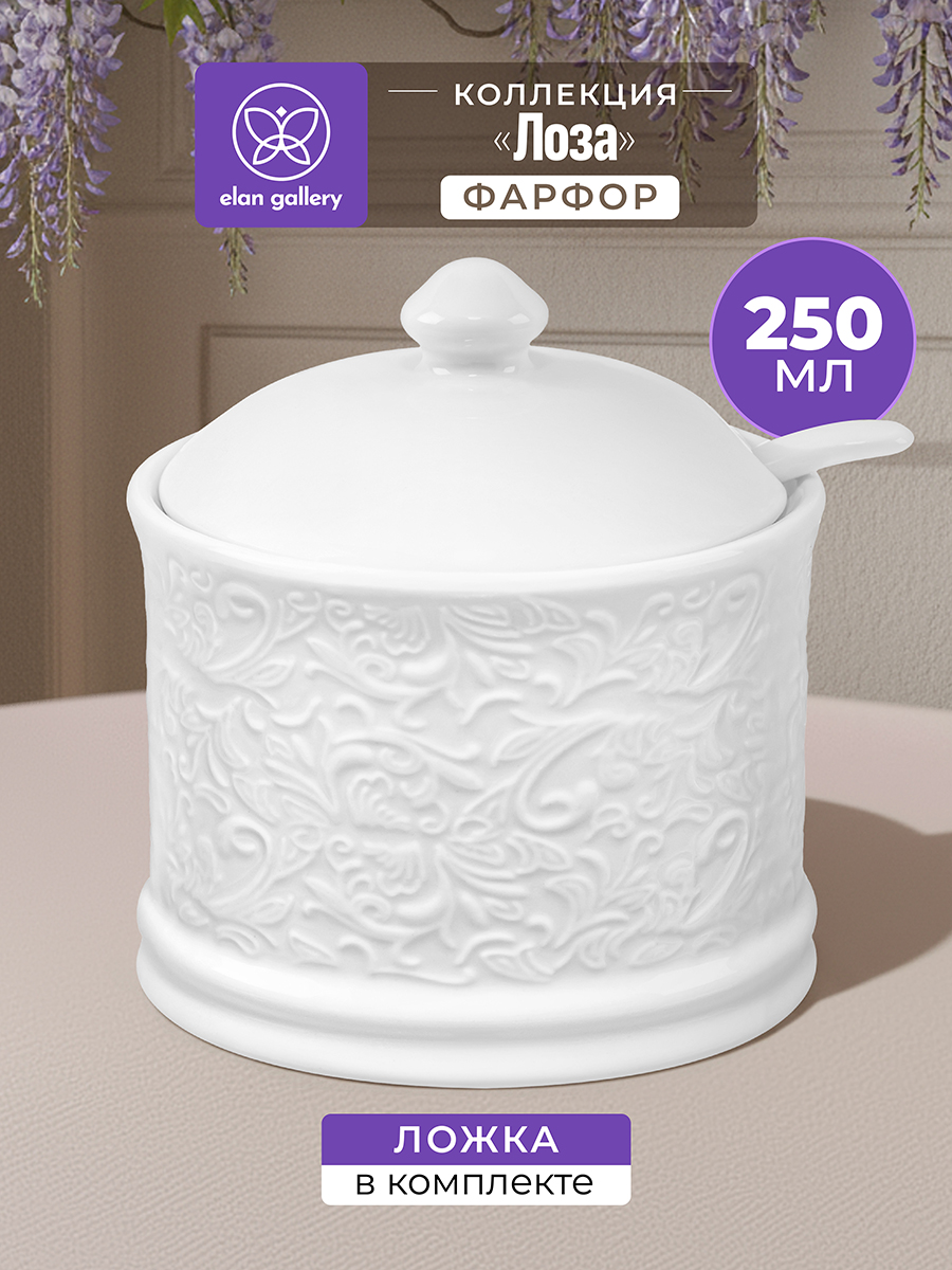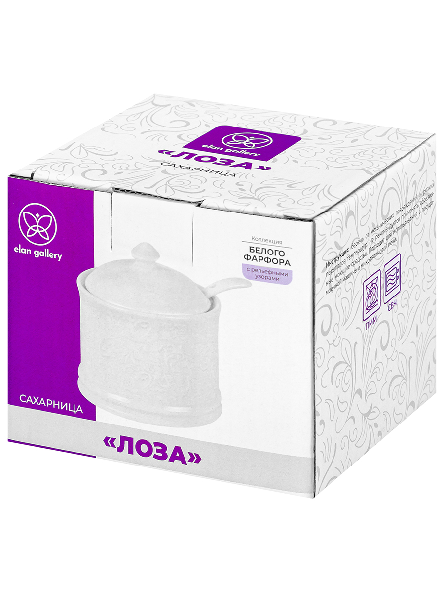 Сахарница из серии «Лоза» от Elan Gallery предназначена для эстетичной сервировки вашего стола. Размер ёмкости – 9х9х10 см, объём – 250 мл. Выполнена из высококачественного белого фарфора. Он не впитывает цвет продуктов и легко отмывается, благодаря чему надолго сохранит свою белизну. Поверхность украшает рельефный узор в виде тонкой, элегантной лиственной лозы. Поставляется в комплекте с фарфоровой ложкой размером 11х2,5 см. Декоративная баночка добавит особого шарма вашему кухонному инвентарю. Она подойдёт для хранения не только сахара, но и соли, специй и приправ. Засыпьте внутрь чай или кофе, чтобы в любой момент заварить свежий напиток. Подайте её вместе с горячими блюдами, чтобы каждый мог приправить пищу по своему вкусу. Поможет отпраздновать Широкую Масленицу со вкусом! Масленица – это чудесный повод собраться за праздничным столом и насладиться тёплой атмосферой и традиционной русской кухней. Стильное изделие также можно приспособить под варенье, мёд или икру. Маленькая ложечка позволит набрать необходимое количество продуктов. Она компактно помещается в баночке благодаря выемке на крышке. Такое изделие отлично дополнит сервировку стола как для сытного завтрака, так и для уютного чаепития. Не рекомендуется применять абразивные моющие средства. Подходит для использования в посудомоечной машине и микроволновой печи. Поставляется в дизайнерской картонной коробке – благодаря ей вам не потребуется дополнительная подарочная упаковка. Фарфоровая сервировочная посуда будет оригинальным подарком для хозяйки, ценящей не только практичность, но и привлекательность. В ассортименте бренда Elan Gallery вы найдёте предметы декора и красивую посуду для приготовления и сервировки масленичных блюд. Пусть Масленичная неделя принесет вам радость и множество вкусных моментов!