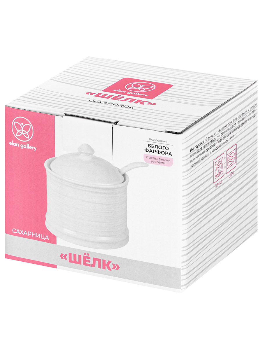 Сахарница из серии «Шёлк» от Elan Gallery предназначена для эстетичной сервировки вашего стола. Размер ёмкости – 9х9х10 см, объём – 250 мл. Выполнена из высококачественного белого фарфор. Он не впитывает цвет продуктов и легко отмывается, благодаря чему надолго сохранит свою белизну. Поверхность украшена частым горизонтальным рельефом. Поставляется в комплекте с фарфоровой ложкой размером 11х2,5 см. Декоративная баночка добавит особого шарма вашему кухонному инвентарю. Она подойдёт для хранения не только сахара, но и соли, специй и приправ. Засыпьте внутрь чай или кофе, чтобы в любой момент заварить свежий напиток. Подайте её вместе с горячими блюдами, чтобы каждый мог приправить пищу по своему вкусу. Поможет отпраздновать Широкую Масленицу со вкусом! Масленица – это чудесный повод собраться за праздничным столом и насладиться тёплой атмосферой и традиционной русской кухней. Стильное изделие также можно приспособить под варенье, мёд или икру. Маленькая ложечка позволит набрать необходимое количество продуктов. Она компактно помещается в баночке благодаря выемке на крышке. Такое изделие отлично дополнит сервировку стола как для сытного завтрака, так и для уютного чаепития. Не рекомендуется применять абразивные моющие средства. Подходит для использования в посудомоечной машине и микроволновой печи. Поставляется в дизайнерской картонной коробке – благодаря ей вам не потребуется дополнительная подарочная упаковка. Фарфоровая сервировочная посуда будет оригинальным подарком для хозяйки, ценящей не только практичность, но и привлекательность. В ассортименте бренда Elan Gallery вы найдёте предметы декора и красивую посуду для приготовления и сервировки масленичных блюд. Пусть Масленичная неделя принесет вам радость и множество вкусных моментов!