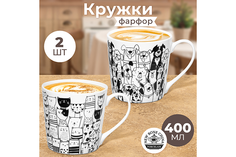 Набор 2 кружек «Коты и собаки» от Elan Gallery предназначен для эстетичной сервировки вашего стола. Размер каждой ёмкости – 12,5х9,5х9 см, объём – 400 мл. Выполнены из фарфора нового поколения new bone china, сочетающего в себе изящность и высокую прочность. За счёт гладкости изделия легко отмываются, поэтому сохраняют привлекательный внешний вид и практичны в использовании. Плотная структура материала позволяет посуде дольше сохранять температуру напитков. От других видов костяного фарфора new bone china отличается большей экологичностью в производстве. На белые кружки нанесены чёрные контурные собаки и кошки. Кофейные кружки помогут вам провести множество приятных завтраков с капучино и латте, а также уютные чайные вечера с конфетами, вафлями, другими десертами и сладостями. Подойдут ценителям чая и кофе, которые любят пить из красивой и необычной посуды. Согрейтесь зимой любимым напитком: какао с маршмэллоу, ягодным чаем или горячим шоколадом. Летом освежитесь домашним лимонадом или морсом. Декоративный комплект поможет вам организовать запоминающееся чаепитие. Не рекомендуется применять абразивные моющие средства. Подходят для использования в посудомоечной машине и микроволновой печи. Поставляются в дизайнерской картонной коробке – благодаря ей вам не потребуется дополнительная подарочная упаковка. Фарфоровая сервировочная посуда будет оригинальным подарком для хозяйки, ценящей не только практичность, но и привлекательность. Набор кружек от бренда Элан Галерея позволит насладиться тёплой атмосферой в компании чудесных зверушек. Пусть ваш день наполнится радостью и весельем!