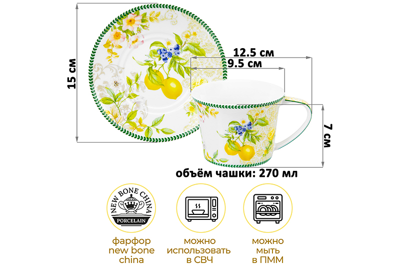 Чайный набор Elan Gallery "Лимоны" состоит из 12 предметов и выполнен из фарфора new bone china. Можно использовать как кофейный или для сервировки любых других напитков. New bone china сочетает в себе изящность и высокую прочность. От других видов костяного фарфора материал отличается большей экологичностью в производстве. В состав набора входят 6 чашек объёмом 270 мл и размером 12,5х9,5х7 см каждая, 6 блюдец размерами 15х15х2 см. Серия "Лимоны" украшена ярким принтом с сочными лимонами, синими ягодками и нежными цветочками. Набор на шесть персон подходит для любителей чая и кофе. Вы сможете насладиться своими любимыми напитками из чашки с красивым рисунком и удивить гостей. Используйте блюдце как подставку под чашку. Положите на тарелочку кусочек торта, домашнего пирога или пирожное. Сервировочная тарелка подойдёт не только для десерта, но и закусок: сырной нарезки, сырокопчёной колбасы или свежих овощей и зелени. Посуда из фарфора украсит интерьер вашей кухни. Разместите на блюдце кусочки шашлыка или бутерброды, чтобы перекусить за чашечкой кофе. Не рекомендуется применять абразивные моющие средства. Можно использовать в микроволновой печи и мыть в посудомоечной машине. Поставляется в картонной коробке. Фарфоровая посуда – приятный подарок на любой праздник. Благодаря красочной коробочке не понадобится подарочная упаковка. В коллекции бренда Элан Галерея представлено много красивого кофейного и чайного инвентаря, выберите сервиз на свой вкус. Он станет украшением праздничного стола или добавит эстетики ежедневному чаепитию.