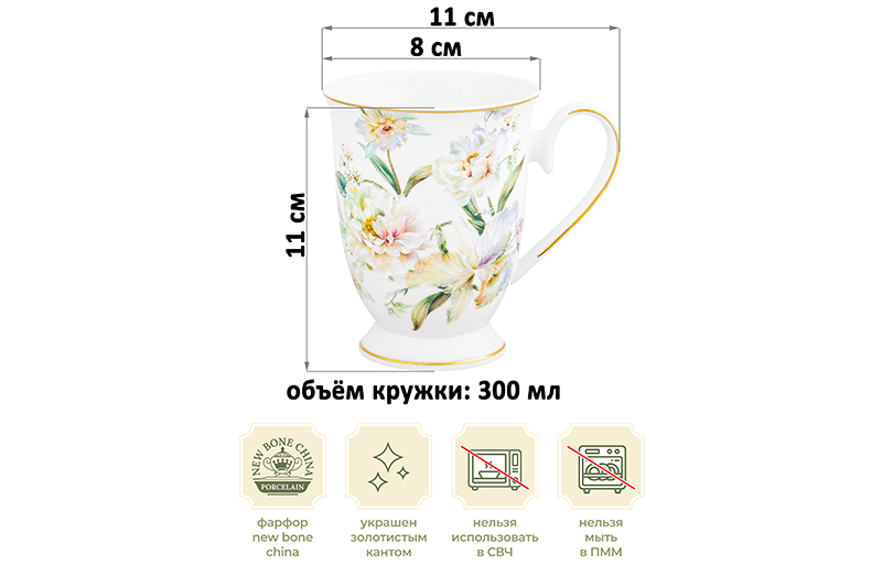 Кружка на изящной ножке из серии "Корнелия" от Elan Gallery предназначена для эстетичной сервировки вашего стола. Размер – 12х8,5х10,5 см, объём – 300 мл. Изготовлена из фарфора нового поколения new bone china, сочетающего в себе изящность и высокую прочность. За счёт гладкости изделие легко отмывается, поэтому сохраняет привлекательный внешний вид и практично в использовании. Плотная структура материала позволяет чашкам дольше сохранять температуру напитков. От костяного фарфора new bone china отличается большей экологичностью в производстве. Поверхность изделия овивают обворожительные белые пионы. Они выполнены в манере, вдохновлённой акварельным рисунком. Тонкая золотистая окантовка служит деликатным акцентом и подчёркивает изысканность. Декоративная кружечка поможет провести множество приятных завтраков с капучино и латте, а также уютные чайные вечера с конфетами, вафлями, другими десертами и сладостями. Подойдёт ценителям чая и кофе, которые любят пить из красивой и необычной посуды. Согрейтесь зимой любимым напитком: какао с маршмеллоу, ягодным чаем или горячим шоколадом. Летом освежитесь домашним лимонадом или морсом. Не рекомендуется применять абразивные моющие средства. Бокал нельзя использовать в посудомоечной машине и микроволновой печи. Поставляется в дизайнерской картонной коробке – благодаря ей вам не потребуется дополнительная подарочная упаковка. Фарфоровая сервировочная посуда станет чудесным подарком на любой праздник и добавит эстетики ежедневному чаепитию. Серия "Корнелия" от бренда Элан Галерея добавит вашему кухонному инвентарю лёгкости и элегантности, преобразив любую сервировку!