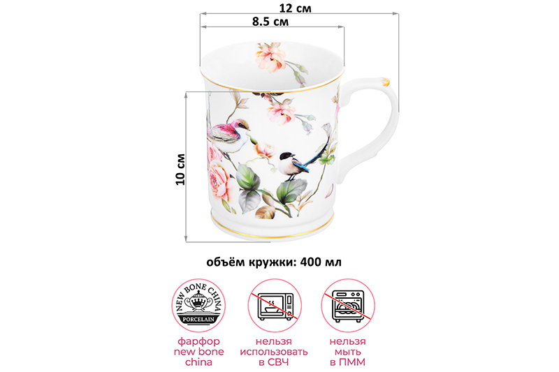 Кружка Elan Gallery "Певчие птички" размером 12х8,5х10 см и объёмом 400 мл выполнена из фарфора нового поколения new bone china. Материал сочетает в себе изящность и высокую прочность. От других видов костяного фарфора отличается большей экологичностью в производстве. Белая кружечка с изображениями птичек и розовых цветов украшена золотистым кантом. Она поможет провести множество приятных завтраков с капучино или латте, а также уютных чайных вечеров. Кружка подходит ценителям чая и кофе, которые любят пить из красивой и необычной посуды. Это идеальный вариант для того, чтобы согреться горячим напитком зимой и освежиться прохладным лимонадом летом. Интересная кружка с удобной ручкой украсит ваш стол своим красивым дизайном как на праздник, так и в будни. Посуда из фарфора идеально впишется в любой интерьер вашей кухни. Фарфоровые чашки отличаются от керамических повышенной плотностью. Они не впитывают цвет кофе, чая, глинтвейна, других горячих напитков и не деформируются от влаги, чему может быть подвержена керамика. Не рекомендуется применять абразивные моющие средства. Из-за золотого канта не подходит для использования в микроволновой печи и посудомоечной машине. Бокал поставляется в стильной картонной упаковке. Фарфоровая посуда – отличный подарок на любой праздник. Благодаря красочной коробочке не понадобится дополнительная подарочная упаковка. Наслаждайтесь любимыми напитками из этой кружечки сами, либо сделайте оригинальный подарок своим близким! В коллекции бренда Элан Галерея представлено много стильных товаров для дома, в том числе всё для эстетичного чаепития. Выберите варианты на свой вкус!