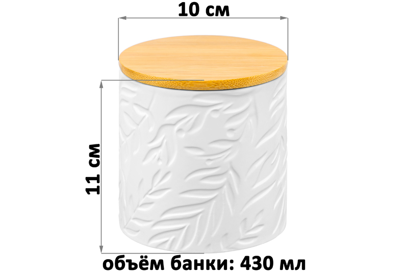 Банка от Elan Gallery предназначена для организации хранения продуктов на вашей кухне. Размер ёмкости – 10х10х11 см, объём – 430 мл. Выполнена из керамики и имеет белый цвет, поверхность украшена рельефным лиственным узором. Крышка выполнена из натурального бамбука и оснащена силиконовым уплотнителем. Изделие отлично подойдёт для хранения сыпучих продуктов: сахара и соли, чая и кофе, приправ и специй. Храните в баночке ягоды, орехи и сухофрукты. Заполните её любимыми сладостями: леденцами, конфетами или печеньем. Подайте к столу, чтобы идеально дополнить чайную сервировку! Герметичная деревянная крышечка защитит ваши продукты от попадания грязи и пыли. Коллекция из трёх баночек нежных природных цветов впишется в любой интерьер и позволит организовать хранение даже на открытых полках. Не рекомендуется применять абразивные моющие средства. Не подходит для использования в микроволновой печи. Без бамбуковой крышки подходит для посудомоечной машины. Бамбук нельзя замачивать! Поставляется в дизайнерской картонной коробке – благодаря ей вам не потребуется дополнительная подарочная упаковка. Это идеальный подарок для хозяйки, ценящей не только практичность, но и стиль. В ассортименте бренда Элан Галерея представлены банки для хранения на любой вкус. Соберите целый набор кухонных контейнеров для эстетичного хранения продуктов на вашей кухне!