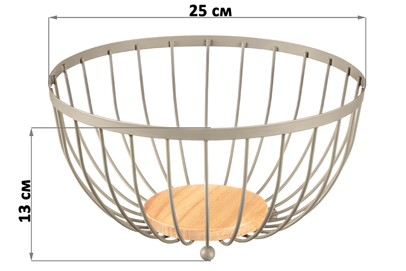Корзинка для фруктов «Мокко» от ELCASA предназначена для красивой подачи к столу разнообразных угощений. Размер изделия – 25х25х13 см, диаметр бамбукового дна – 10 см. Выполнена из металла и имеет сетчатую структуру, которая обеспечивает хорошую вентиляцию и поможет сохранить свежесть продуктов. Деревянное дно представляет собой стильный акцент, гармонично сочетающийся со светлым оттенком металлического корпуса. Благодаря минималистичному дизайну и лаконичному цвету корзина гармонично впишется в любой интерьер, что делает её универсальным аксессуаром для кухни, столовой и гостиной. Используйте её для хранения и сервировки фруктов и овощей, заполните выпечкой, хлебом или сладостями. Подайте к столу свои любимые закуски и удивите гостей эстетичной сервировкой! Корзиночка станет не только функциональным, но и декоративным элементом для вашего дома. Разложите в стильной вазе искусственные фрукты и поставьте на журнальный столик, чтобы сделать её украшением любой комнаты. Не рекомендуется применять абразивные моющие средства. Не подходит для использования в посудомоечной машине и микроволновой печи. Универсальная настольная фруктовница послужит оригинальным подарком для хозяйки, ценящей не только практичность, но и привлекательность. Стильное изделие от бренда ЭЛЬКАСА станет прекрасным дополнением вашего сервировочного инвентаря и поможет создать в доме атмосферу уюта!