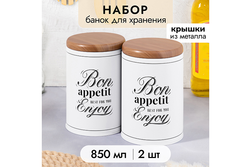Набор 2 банок для хранения послужит органайзером на вашей кухне. Размер каждой ёмкости – 9,5х9,5х14 см, объём – 850 мл. Выполнены из жести. «Bon Appetit» – это коллекция посуды в стиле френч-винтаж, которая создаст на вашей кухне атмосферу романтики и уюта. Отличительные черты серии – это сочетание светлых оттенков и монохромной картинки, стилизованной под ретро. Лаконичная фраза «Bon Appetit. Best for you. Enjoy» («Приятного аппетита. Лучшее – для вас. Наслаждайтесь») добавит изысканности интерьеру вашей кухни. Крышки изделий визуально имитируют древесину. Каждая баночка отлично подойдёт для разнообразных сыпучих продуктов: чая, кофе, сахара и соли, приправ и специй. Храните в них крупы, ягоды, орехи и сухофрукты. Заполните контейнеры маленькими сладостями: конфетами, леденцами или драже. Подайте баночки к столу, чтобы идеально дополнить чайную сервировку! Герметичная крышка защитит ваши продукты от попадания пыли и грязи. Не рекомендуется применять абразивные моющие средства. Не подходят для использования в посудомоечной машине и микроволновой печи. Поставляются в красивой картонной коробке – благодаря ей вам не потребуется дополнительная подарочная упаковка. Это идеальный подарок для хозяйки, ценящей не только практичность, но и стиль. Коллекция посуды «Bon Appetit» впишется в любой интерьер и придаст ему шарма и элегантности!