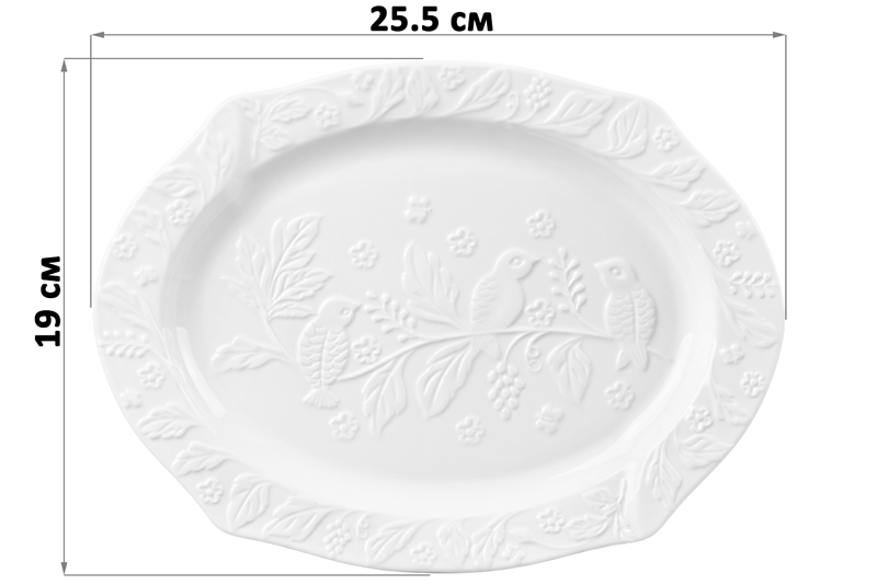 Блюдо “Птички на ветке” предназначено для эстетичного оформления вашего стола. Размер изделия – 25,5х19х2 см. Оно выполнено из высококачественного белого фарфора и украшено рельефным узором в виде лиственных веточек и сидящих на них птиц. Фарфор легко отмывается и не впитывает цвет продуктов. Блюдо отлично послужит для необычной подачи салатов, горячих и холодных угощений, разнообразных закусок, фруктов и конфет. Положите в него канапе, разложите сырную нарезку и украсьте свежей зеленью. Наполните его ломтиками хлеба, чтобы каждый сделал бутерброд себе по вкусу. Не рекомендуется применять абразивные моющие средства. Подойдёт для использования в посудомоечной машине и микроволновой печи. Стильное блюдо поможет вам разнообразить сервировку стола и станет настоящим украшением вашего кухонного инвентаря!