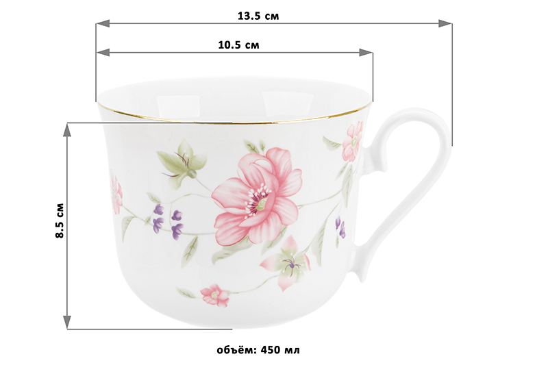 Кружка Elan Gallery "Диана" размером 13,5х10,5х8,5 см и объёмом 450 мл выполнена из качественного фарфора. Кружечка с изображениями розовых и фиолетовых цветов украшена золотистым кантом. Она поможет провести множество приятных завтраков с капучино или латте, а также уютных чайных вечеров. Большая кружка подходит ценителям чая и кофе, которые любят пить из красивой и необычной посуды. Это идеальный вариант для того, чтобы согреться горячим напитком зимой и освежиться прохладным лимонадом летом. Кружка широкой формы с удобной ручкой украсит ваш стол своим красивым дизайном как на праздник, так и в будни. Фарфоровые изделия отличаются от керамических повышенной плотностью. Они не впитывают цвет кофе, чая, глинтвейна, других горячих напитков и не деформируются от влаги, чему может быть подвержена керамика. Не рекомендуется применять абразивные моющие средства. Из-за золотого канта не подходит для использования в СВЧ (микроволновой печи) и ПММ (посудомоечной машине). Поставляется в стильной картонной упаковке. Фарфоровая посуда – оригинальный подарок родным или друзьям, а также коллеге по работе. Подарите кружку маме, бабушке, дочке или подруге на любой праздник. Наслаждайтесь любимыми напитками из этой кружечки сами, либо сделайте оригинальный подарок своим близким!