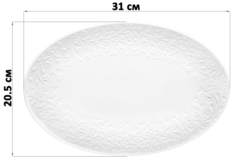 Овальное блюдо из серии «Веточки-цветочки» от Elan Gallery предназначено для эстетичной сервировки вашего стола. Размер изделия – 31х20,5х2,5 см. Выполнено из высококачественного белого фарфора. Он не впитывает цвет продуктов и легко отмывается, благодаря чему надолго сохраняет свою белизну. Поверхность изделия украшают рельефные узоры в виде лиственных веточек с аккуратными цветочными бутончиками. Тарелка подойдёт для подачи рыбных и мясных блюд, а также разнообразных закусок. Благодаря её вместительности можно красиво подать целую курицу, рыбу и любое мясо. Используйте для сервирования салатов, сырной нарезки, овощей и фруктов, чтобы угостить большое количество гостей. На сервировочных блюдах удобно разместить кусочки торта или пирога, конфеты, зефир, а также другие десерты и сладости. Подойдёт для красивой подачи суши, роллов и бутербродов на завтрак. Благодаря лаконичному дизайну изделие впишется в интерьер любой кухни, столовой и гостиной. Не рекомендуется применять абразивные моющие средства. Подходит для использования в посудомоечной машине и микроволновой печи. Поставляется в дизайнерской картонной коробке – благодаря ей вам не потребуется дополнительная подарочная упаковка. Фарфоровая сервировочная посуда будет оригинальным подарком для хозяйки, ценящей не только практичность, но и привлекательность. Серия «Веточки-цветочки» от бренда Элан Галерея станет украшением любого кухонного инвентаря и позволит собрать красивый сервиз в едином стиле!