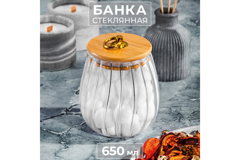 Стеклянная банка объемом 650 мл с крышкой из бамбука и силиконовым уплотнителем поможет организовать хранение сыпучих продуктов на вашей кухне. Размеры баночки – 10,5х10,5х13 см, высота без крышки – 11 см. Прозрачная ёмкость подойдет для чая, кофе, сахара, соли, приправ, специй, круп и орехов. Благодаря силиконовому уплотнителю крышечка плотно прилегает к контейнеру, что предотвратит риск рассыпания продуктов и сохранит их полезные свойства и аромат. Бамбуковая крышка украшена ручкой в виде золотистого кольца, что придает баночке нарядный вид. Декоративная посуда поможет не только навести порядок на вашей кухне, ее стильный дизайн с узором в виде полосок подойдет к любому интерьеру и поможет создать уют. Используйте банку не только для сыпучих продуктов, как красиво будут смотреться в стеклянной емкости конфеты, печенье, мармелад, варенье и другие сладости! Нельзя использовать в СВЧ. Можно мыть в ПММ без крышки (бамбуковую крышку нельзя замачивать). Поставляется в стильной картонной упаковке. Баночка для сыпучих продуктов из стекла – идеальный подарок любой хозяйке, теперь все продукты будут под рукой. Она станет настоящим украшением вашего дома или чудесным подарком для родных и близких!