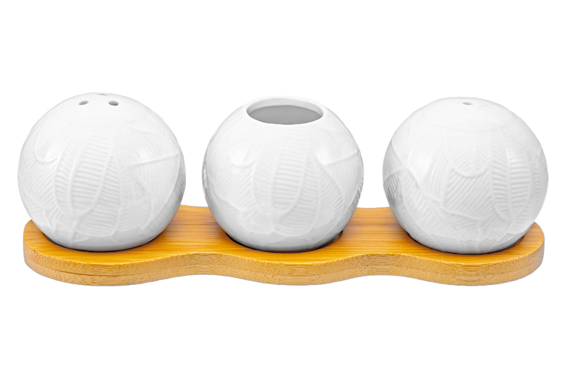 Сервировочный набор из серии «Танзания» от Elan Gallery предназначен для эстетичного оформления вашего стола. Включает в себя баночку для зубочисток (зубочистки в комплекте), солонку и перечницу. Общий размер изделия – 20х6,5х6 см, размер каждой ёмкости – 6х6х5 см, объём – 75 мл. Выполнены из высококачественного белого фарфора и украшены рельефом налегающих друг на друга тропических листьев с тонкими прожилками. Подставка выполнена из бамбука. Благодаря набору во время приготовления пищи, а также застолий, всё необходимое будет под рукой. Благодаря маленькой вазочке вы всегда сможете компактно хранить зубочистки. Ёмкости для специй и приправ можно заполнить сахаром и солью, чтобы каждый имел возможность приправить блюда по своему вкусу. Не рекомендуется применять абразивные моющие средства. Без бамбуковых элементов подходит для использования в микроволновой печи и посудомоечной машине. Бамбук нельзя замачивать! Поставляется в дизайнерской картонной коробке – благодаря ей вам не потребуется дополнительная подарочная упаковка. Это идеальный подарок для хозяйки, ценящей не только практичность, но и привлекательность. Серия «Танзания» от бренда Элан Галерея станет украшением любого кухонного инвентаря и позволит собрать сервиз в едином стиле!