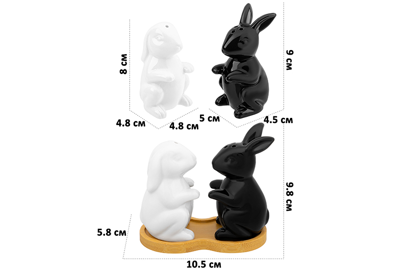 Набор для специй на бамбуковой подставке от Elan Gallery "Кролики" общим размером 10,5х5,8х9,8 см состоит из 2 предметов. В комплект входят: перечница в виде белого кролика размером 4,8х4,8х8 см и солонка в форме чёрного кролика 5х4,5х9 см. Объём каждой фигурки 45 мл. Фигурные ёмкости для соли и перца украсят обеденный стол в будни и помогут создать красивую сервировку праздничного стола. Посуда в виде милых животных выполнена из фарфора и станет украшением интерьера кухни или столовой. Благодаря необычным органайзерам на подставке из натурального бамбука вы можете устроить праздничный ужин у себя дома с сервировкой не хуже, чем в ресторане. Столовые принадлежности для эстетичного хранения соли, перца или приправ позволят держать всё необходимое под рукой в процессе приготовления еды. Можно использовать для любых сыпучих продуктов, например, корицы. Фарфоровые контейнеры наполняются через отверстия внизу, которые закрываются пластиковыми пробками. Не рекомендуется применять абразивные моющие средства. Без подставки декоративные баночки можно использовать в посудомоечной машине. Бамбук нельзя замачивать! Настольный комплект поставляется в стильной картонной коробке. Красивый кухонный инвентарь станет чудесным подарком на любой праздник. Благодаря красочной коробочке не понадобится дополнительная подарочная упаковка. В коллекции бренда Elan Gallery вы найдёте множество как ярких, так и нежных декоративных украшений – каждый обязательно подберёт сувенир на свой вкус. Они станут чудесным подарком для родных, близких и коллег. Наполните пространство вокруг себя уютом и эстетикой!