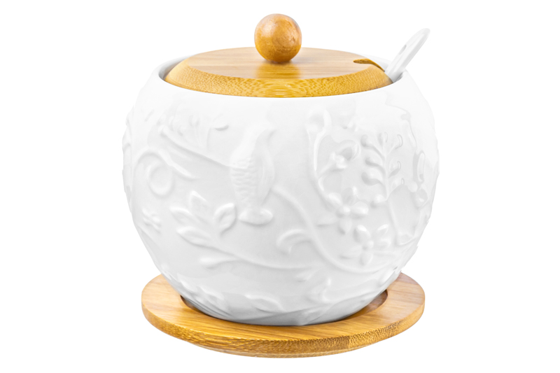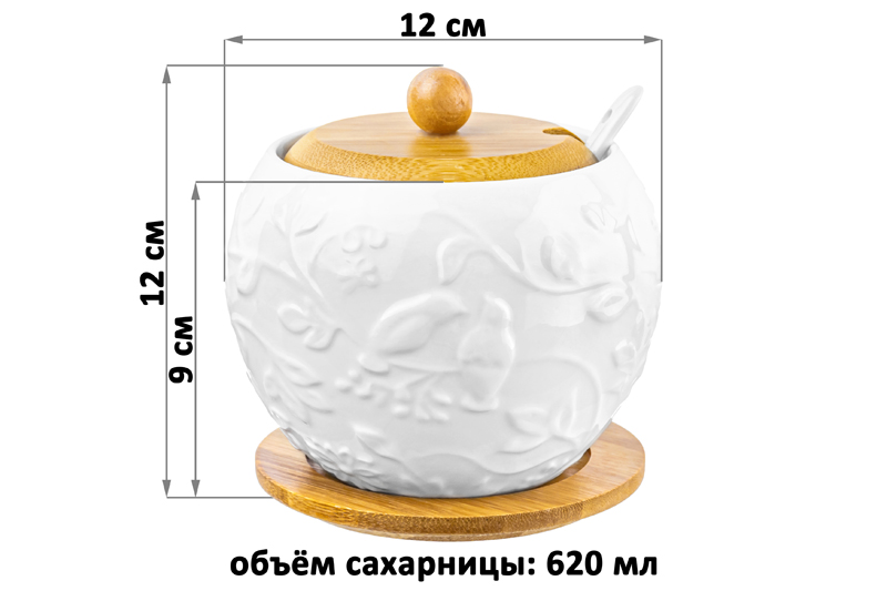 Сахарница серии "Птички на ветке" объемом 620 мл имеет деревянную крышку, фарфоровую ложку и деревянную подставку. Подойдет для хранения и красивой подачи сахара, меда, чая и многих других продуктов. Набор выполнен из высококачественного фарфора и натурального бамбука. Сахарница украшена рельефными изображениями птичек и растительными орнаментами. У сахарницы широкое горло, которое удобно мыть, а бамбуковая крышка не позволит сахару намокнуть. Деревянные детали набора нельзя использовать в микроволновой печи и посудомоечной машине. Размер набора 12х12х12 см. Поставляется в яркой картонной упаковке. Сахарница из серии посуды "Птички на ветке" сможет стать настоящим украшением кухни или приятным подарком для ваших родных и близких!