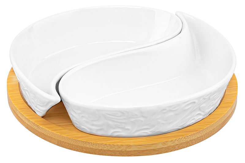 Тарелка под оливки «Инь-Янь» из серии «Лоза» на деревянной подставке от Elan Gallery подойдёт для сервировки закусок. Общий размер изделия – 15х15х3,5 см. Размер каждой ёмкости – 14х7х2,5 см, объём – 100 мл. Выполнена из высококачественного белого фарфора. Он не впитывает цвет продуктов и легко отмывается, благодаря чему надолго сохранит свою белизну. Поверхность изделия украшает рельеф в виде тонкой, элегантной лиственной лозы. Подставка выполнена из натурального бамбука. С маленькой менажницей вы сможете красиво подать маслины, орехи или сыры. Она послужит и в качестве небольшой конфетницы, поможет угостить себя и гостей любимыми сладостями за праздничным столом. Не рекомендуется применять абразивные моющие средства. Без бамбуковой подставки подходит для использования в посудомоечной машине и микроволновой печи. Бамбук нельзя замачивать! Поставляется в дизайнерской картонной коробке – благодаря ей вам не потребуется дополнительная подарочная упаковка. Фарфоровая сервировочная посуда послужит оригинальным подарком для хозяйки, ценящей не только практичность, но и привлекательность. Серия «Лоза» от бренда Элан Галерея станет украшением любого кухонного инвентаря и позволит собрать сервиз в едином стиле!