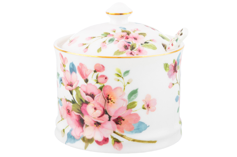 Сахарница Elan Gallery "Яблоневый цвет на белом" размером 9х9х10 см и объёмом 250 мл с ложкой выполнена из высококачественного фарфора New Bone China. Высота изделия без крышки – 6,5 см. Это фарфор нового поколения, не уступающий по качеству традиционному костяному фарфору, но при этом гораздо более экологичный в производстве. Баночка украшена розовыми цветами яблони на белом фоне и обрамлена золотым окаймлением. Ёмкость подойдёт для хранения сахара, а также других продуктов, таких как варенье, мёд и даже икра. Фарфоровая баночка с маленькой ложечкой станет отличным элементом декора вашей кухни! Можно использовать для хранения специй и приправ, чтобы во время приготовления пищи всё было под рукой. Из-за золотого окаймления нельзя использовать в микроволновой печи и посудомоечной машине. Поставляется в стильной картонной упаковке. Подарочная фарфоровая баночка порадует ваших близких на любой праздник или станет украшением вашего стола!