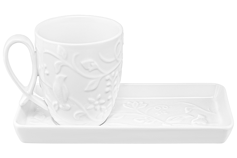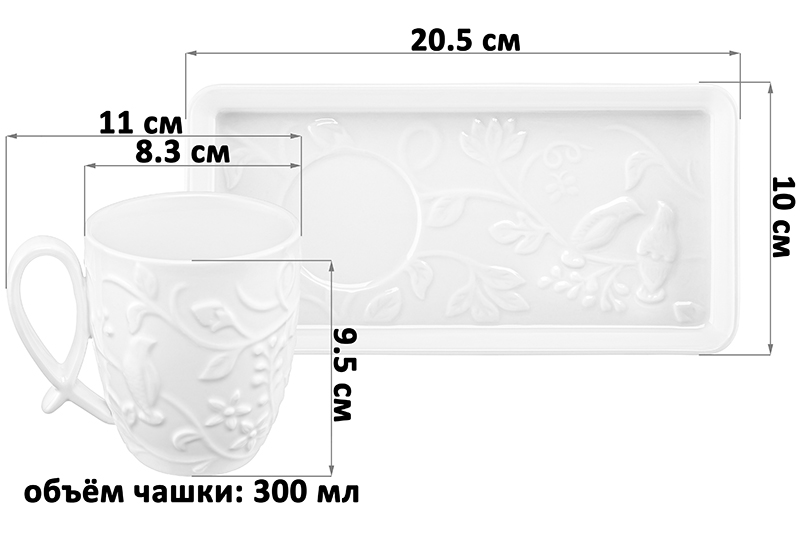Чашка с блюдцем для десерта Elan Gallery "Птички на ветке" выполнены из фарфора. Объём чашки – 300 мл, размер блюдца – 20,5х10х2 см. Чашка и блюдце украшены изящным рельефным узором. Блюдечко имеет необычную прямоугольную форму. Кружка с блюдцем подходят ценителям чая и кофе, которые любят пить из красивой и необычной посуды. Интересная чашка с удобной ручкой украсит ваш стол своим стильным дизайном как на праздник, так и в будни. Это идеальный вариант для того, чтобы согреться горячим чаем зимой и освежиться прохладным лимонадом летом. Используйте блюдце как подставку для чашки, чтобы порадовать гостей изящной сервировкой. Положите на блюдце кусочек торта, домашнего пирога или пирожное. Небольшая тарелочка подойдёт не только для десерта, но и закусок: сырной нарезки, сырокопчёной колбасы или свежих овощей и зелени. Не рекомендуется применять абразивные моющие средства. Чайную пару можно использовать в микроволновой печи и посудомоечной машине. Поставляется в красивой картонной упаковке. Станет приятным подарком вашим близким на любой праздник. В коллекции бренда Elan Gallery можно найти много красивой посуды, кухонный инвентарь и товары для дома. Серия "Птички на ветке" позволит собрать сервиз в едином стиле и станет настоящим украшением вашей кухни!