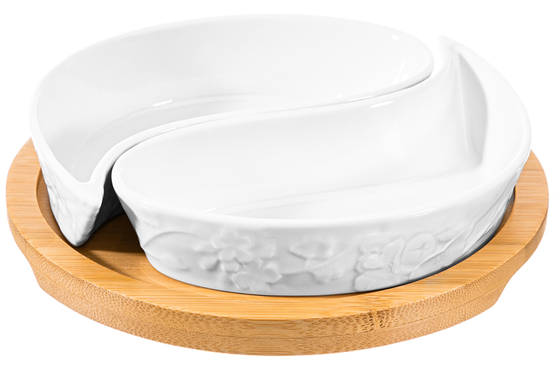 Тарелка под оливки из серии «Цветущая сакура» от Elan Gallery подойдёт для эстетичной сервировки вашего стола. Общий размер изделия – 15,5х15,5х3,5 см. Размер каждой секции – 14х7х2,5 см, объём – 100 мл. Выполнены из высококачественного белого фарфора. Он не впитывает цвет продуктов и легко отмывается, благодаря чему надолго сохранит свою белизну. Поверхность украшена рельефным узором в виде веточек сакуры. Размер подставки – 15,5х15,5х1 см, внутренний диаметр – 13,5 см. Выполнена из натурального бамбука. Менажница поможет красиво подавать маслины, орехи или сыры. Она станет незаменимым элементом праздничных обедов или неторопливых завтраков. Послужит в качестве конфетницы, позволив угостить себя и гостей любимыми сладостями: конфетами, мармеладом, леденцами и безе. Не рекомендуется применять абразивные моющие средства. Без бамбуковой подставки подходит для использования в посудомоечной машине и микроволновой печи. Бамбук нельзя замачивать! Поставляется в дизайнерской картонной коробке – благодаря ей вам не потребуется дополнительная подарочная упаковка. Фарфоровая сервировочная посуда будет оригинальным подарком для хозяйки, ценящей не только практичность, но и привлекательность. Серия «Цветущая сакура» от бренда Элан Галерея украсит любой кухонный инвентарь и позволит собрать красивый сервиз в едином стиле!