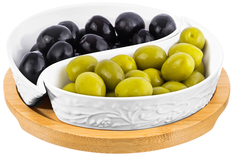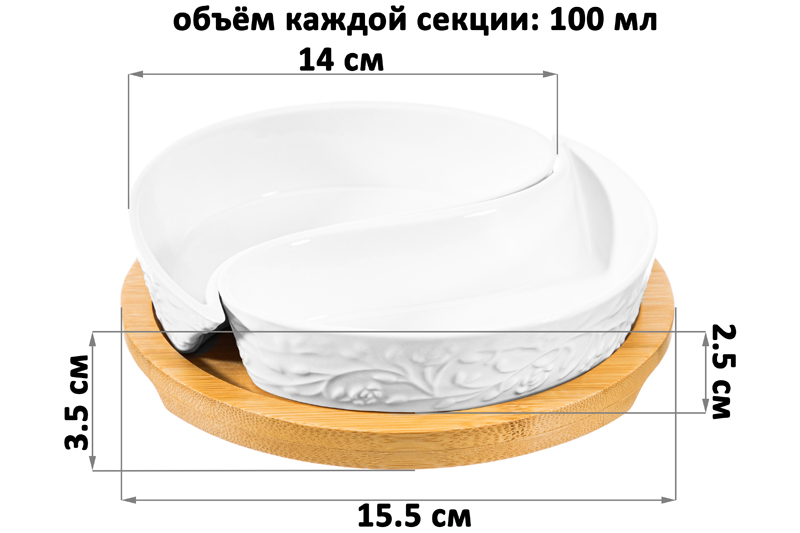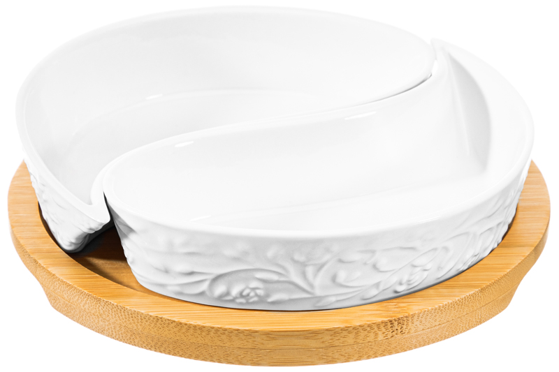 Тарелка под оливки «Инь-Янь» из серии «Веточки-цветочки» на деревянной подставке от Elan Gallery подойдёт для эстетичной сервировки вашего стола. Общий размер изделия – 15,5х15,5х3,5 см, размер каждой секции – 14х7х2,5 см, объём – 100 мл. Выполнена из высококачественного белого фарфора. Он не впитывает цвет продуктов и легко отмывается, благодаря чему надолго сохраняет свою белизну. Поверхность изделий украшают рельефные узоры в виде лиственных веточек с аккуратными цветочными бутончиками. Подставка выполнена из натурального бамбука. Размер подставки – 15,5х15,5х1 см, внутренний диаметр – 13,5 см. Менажница поможет красиво подавать маслины, орехи или сыры. Она станет незаменимым элементом праздничных обедов или неторопливых завтраков. Послужит в качестве конфетницы, позволив угостить себя и гостей любимыми сладостями: конфетами, мармеладом, леденцами или безе. Не рекомендуется применять абразивные моющие средства. Без бамбуковой подставки подходит для использования в посудомоечной машине и микроволновой печи. Бамбук нельзя замачивать! Поставляется в дизайнерской картонной коробке – благодаря ей вам не потребуется дополнительная подарочная упаковка. Фарфоровая сервировочная посуда будет оригинальным подарком для хозяйки, ценящей не только практичность, но и привлекательность. Серия «Веточки-цветочки» от бренда Элан Галерея станет украшением любого кухонного инвентаря и позволит собрать красивый сервиз в едином стиле!