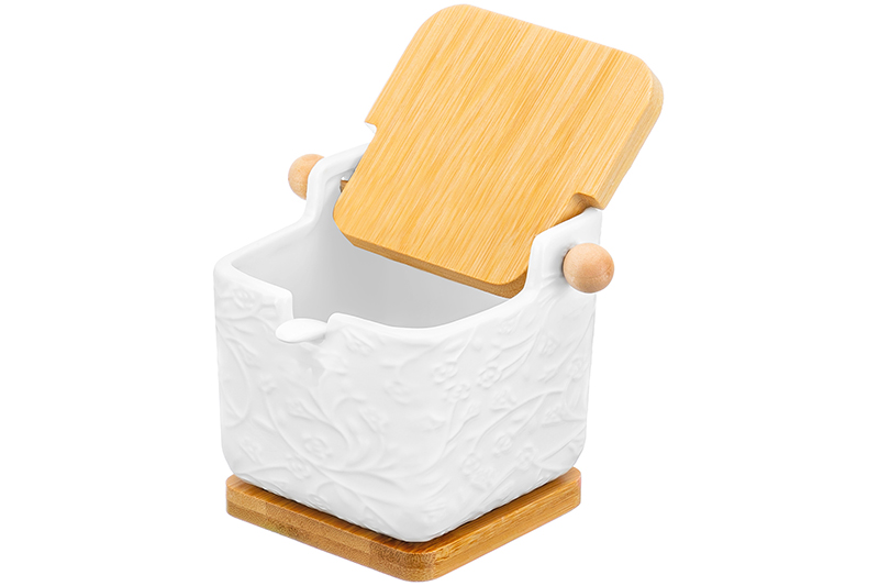 Банка из серии «Веточки-цветочки» от Elan Gallery послужит для организации хранения сыпучих продуктов на вашей кухне. Размер ёмкости – 12х9х9 см, объём – 300 мл. Выполнена из высококачественного белого фарфора. Он не впитывает цвет продуктов и легко отмывается, благодаря чему надолго сохраняет свою белизну. Поверхность изделия украшают рельефные узоры в виде лиственных веточек с аккуратными цветочными бутончиками. Откидная крышка и подставка выполнены из натурального бамбука. Размер подставки – 8х8х1 см. Ёмкость подойдёт для хранения разнообразных сыпучих продуктов. Заполните её сахаром, солью, а также другими специями и приправами, чтобы во время приготовления и приёма пищи всё необходимое было под рукой. Засыпьте внутрь чай или кофе, чтобы в любой момент заварить свежий напиток. Храните в ней крупы и макаронные изделия, ягоды, орехи и сухофрукты. Заполните контейнер сладостями: конфетами, леденцами, пряниками или печеньем. Подайте баночку к столу, чтобы идеально дополнить чайную сервировку! Герметичная бамбуковая крышечка защитит ваши продукты от попадания грязи и пыли. Ложечка поможет вам набрать необходимое количество продуктов и компактно помещается в баночке. Не рекомендуется применять абразивные моющие средства. Не подходит для использования в посудомоечной машине и микроволновой печи. Бамбук нельзя замачивать! Поставляется в дизайнерской картонной коробке – благодаря ей вам не потребуется дополнительная подарочная упаковка. Фарфоровая сервировочная посуда будет оригинальным подарком для хозяйки, ценящей не только практичность, но и привлекательность. Серия «Веточки-цветочки» от бренда Элан Галерея станет украшением любого кухонного инвентаря и позволит собрать красивый сервиз в едином стиле!